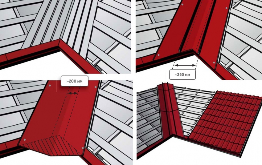 Another extremely important element, the installation rules of which cannot be neglected, is the valley. For each such element, an additional board must be attached. In this case, fastening must be started from the bottom, gradually moving upward and not forgetting about the need for an overlap (in this case, 25-30 cm). Below the level of the eaves, the lower bar is necessarily cut off. Then comes the flanging, under which, as well as under the ridge, a seal is laid.