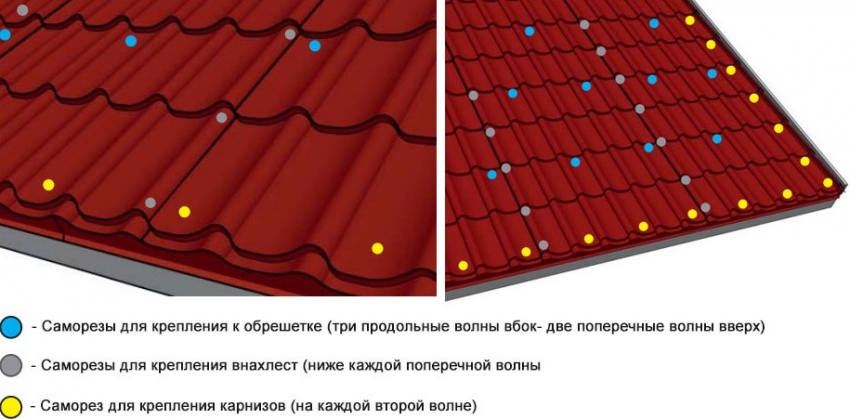 - The service life of the entire roof is highly dependent on the quality of the fasteners used. Therefore, the choice of self-tapping screws must be given due attention. It is important that they are galvanized and must have special seals on the heads that will be able to tightly fill the holes when the self-tapping screw is completely screwed into the hole.