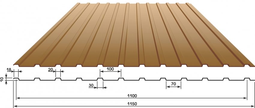 C10 - characterized by a trapezoidal corrugation, used to equip a roof with a sufficiently large angle of inclination. It is most often used for utility and pre-fabricated structures. The profile height is 10 mm, and the dimensions of the corrugated sheet for this type of roof range from 0.5 to 12 m in length and 1.15 m in width. The working width of the sheet is 1.1 m.