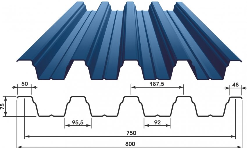 H75 - one of the most durable and reliable roofing options with the maximum profile height. It can be used on the roof with a lathing pitch of up to 4.5 m. At a relatively high sheet price, the dimensions of this type of roofing sheeting are up to 14.5 m in length, and the total and useful width of the sheet is 0.8 and 0.75 m, respectively.
