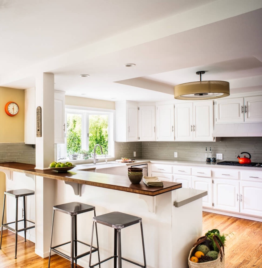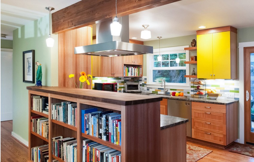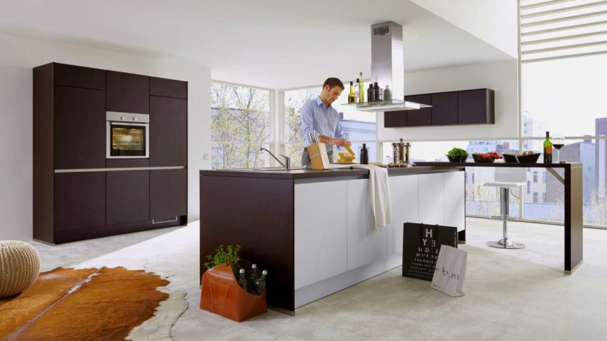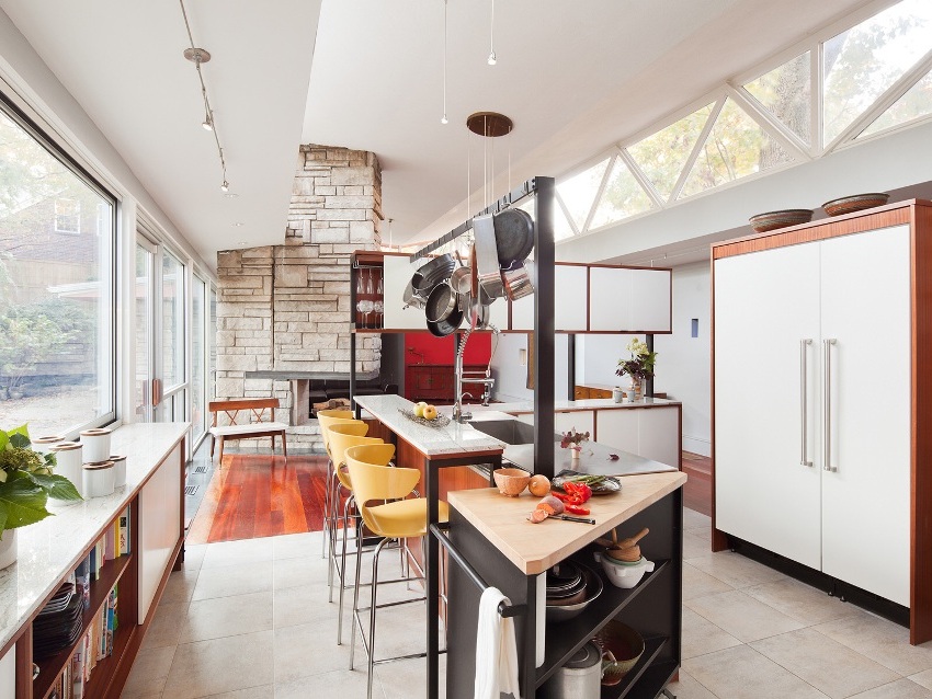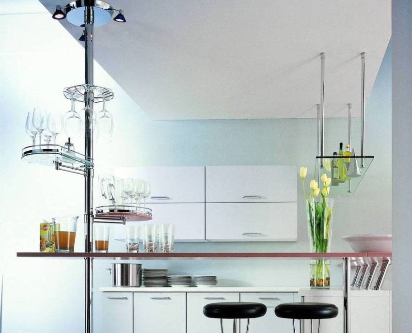Peninsula bar counters are also acceptable in medium sized kitchens. The space below is used as a closet where a minibar or various kitchen items are placed. In such designs, pieces of chrome pipes attached to the cabinet lid serve as a support for the countertops.