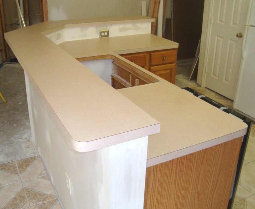 The base plate for the countertop can be acrylic stone, a wide polished board, a piece of chipboard, which is then covered with veneer or film. With the help of a jigsaw, the base is given the necessary shape, and the edges of the edges are carefully cleaned.