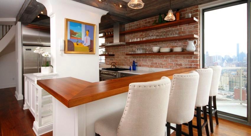 In small apartments, the kitchen bar counter performs several functions at once. It serves to separate the kitchen from the dining room or living area, in parallel it plays the role dining table... The most common option in small rooms is a stand in the form of a small ledge or a structure located along the wall. Photos of bar counters for a small kitchen clearly demonstrate such examples.