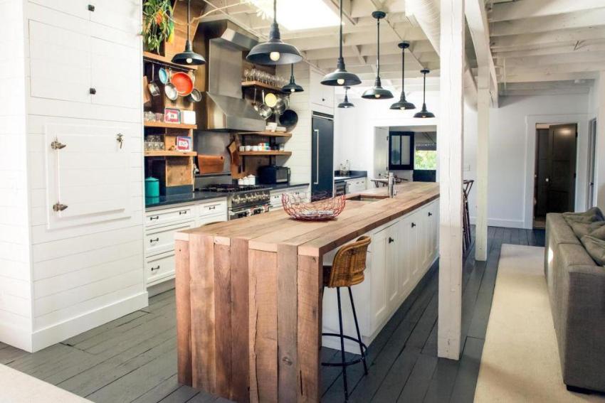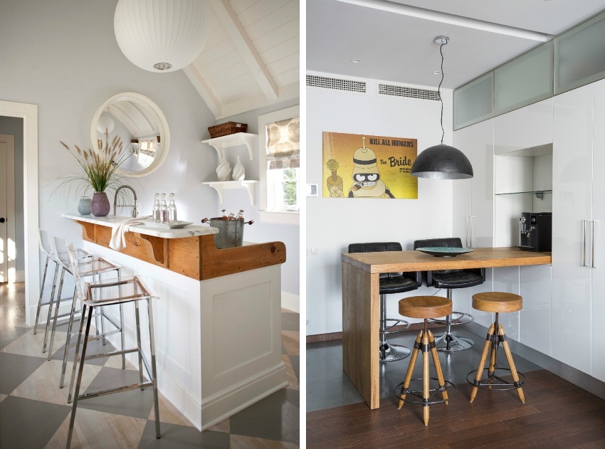 Another interesting option is a counter in which the countertops are placed at different levels. This model is used in spacious studio apartments. One part of the structure is up to 80 cm high, serves as a dining area and is located in the kitchen, and the other is a bar in the living room. Its height is from 110 cm. A combination of this kind is very practical to use and at the same time looks beautiful.