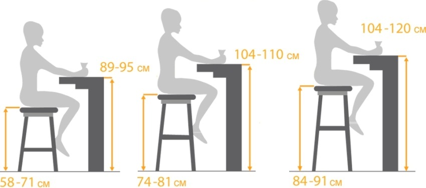 The height of the bar stool is also determined by the location and function. In the area where the bartender works, the optimal location is at a height of 90 cm, and in the guest area - 115-135 cm.