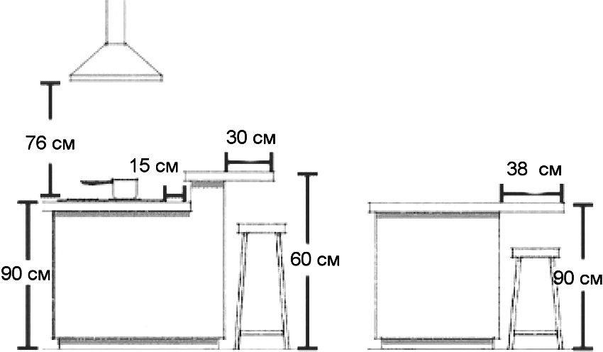 The high countertop is suitable for the bar counter in the living room, the main function of which is to separate the kitchen from the living quarters. An acceptable option is a combined bar counter with worktops, the height of which is 115 and 90 cm, respectively.