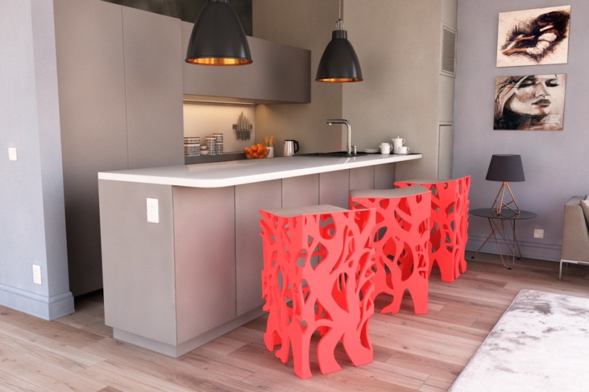 Helpful advice! In order to save kitchen space, tall plastic stools can be purchased instead of traditional bar stools. If necessary, they can be compactly placed, one to one, under the counter. Transparent plastic chairs will look very beautiful and elegant in a small kitchen.