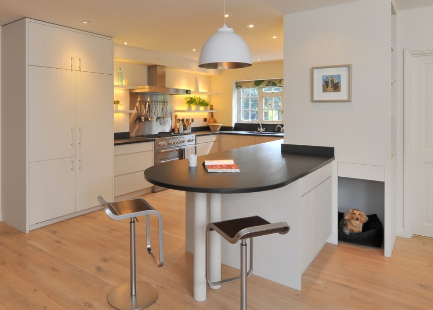 The island bar counter will allow you to maintain a conversation between those sitting on chairs and the hostess near the stove