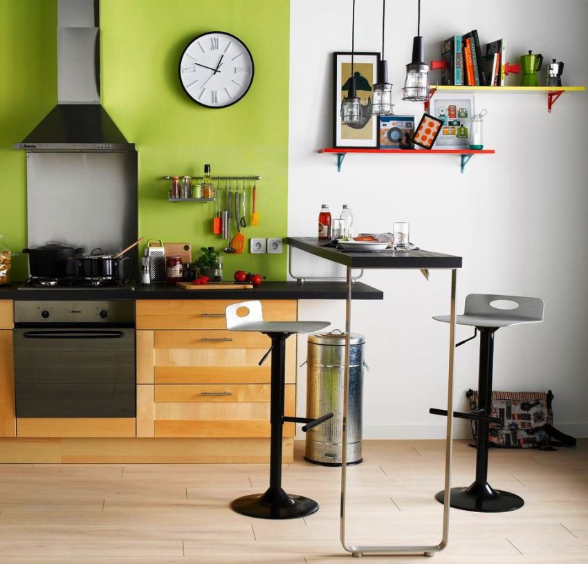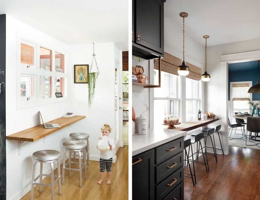 A separate option is a console bar table in the kitchen. It is a table top attached to the wall at a "bar" height of 110 cm. The size of the surface itself depends on the area of the room. This is the perfect solution for a small kitchen.