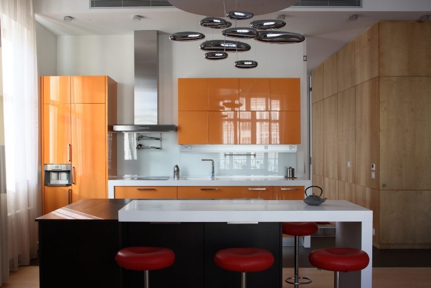 Color solutions can also be different. Bright colors up to fiery red in combination with chrome metal details are especially popular today. It especially fits into high-tech or minimalist style. The gray-beige color gives the interior a feeling of complete peace. It is combined with a countertop that mimics the structure and texture of granite and other natural stones.