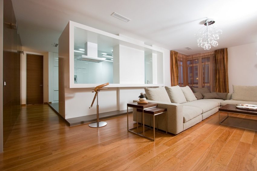 - as a divider of the kitchen into zones, a bar counter is used, equipped with a canopy on top with lighting. An attribute of this design is a nickel-plated pipe connecting the tabletop and the canopy above it to the floor. The pipe is taken 5 - 6 cm in diameter. Shelves and suspensions for glasses are installed on it, which have various design solutions. On one side, such a rack is connected to the cabinet of the kitchen unit, and the second rests on the pipe;