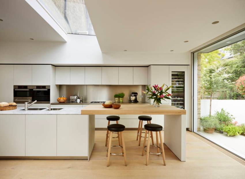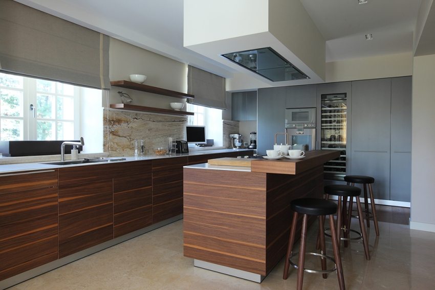 When designing a kitchen interior, designers find a lot of solutions for the construction of a bar counter. This piece of kitchen interior can be of any shape and can be found anywhere in the room. Bar counter can be used not only for its intended purpose, but also serve as a kind of barrier delimiting the premises into zones.