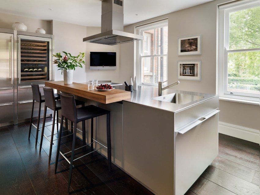 Today it has become fashionable in the Western manner to install a hob and sink in the middle of the room. From the other side, it is inconvenient to approach them. An excellent solution is a device on the opposite side of the bar. This design option is suitable for a fairly large room.