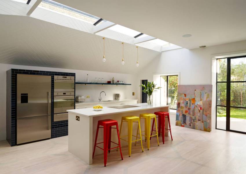 The spacious kitchen can accommodate a spacious dinner table and a small bar counter