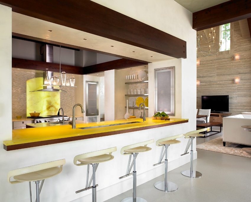 Kitchens and bar counters for them are made from a variety of materials: wood, glass, plastic and even stone. Whatever the furniture is made of, the bar counter creates the impression of a relaxed atmosphere conducive to intimate conversation over a glass of cocktail.