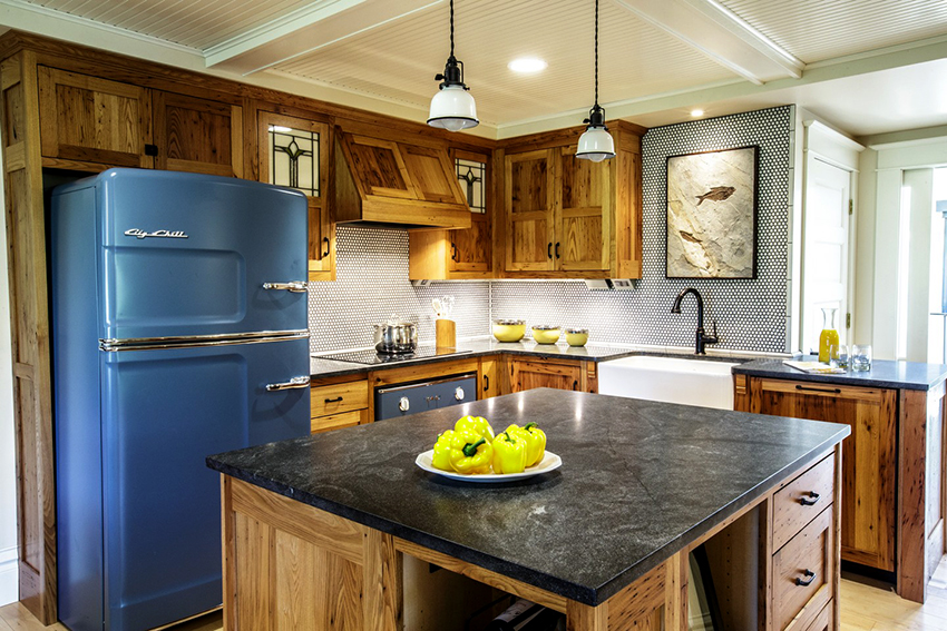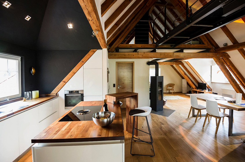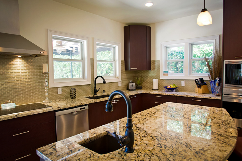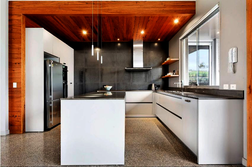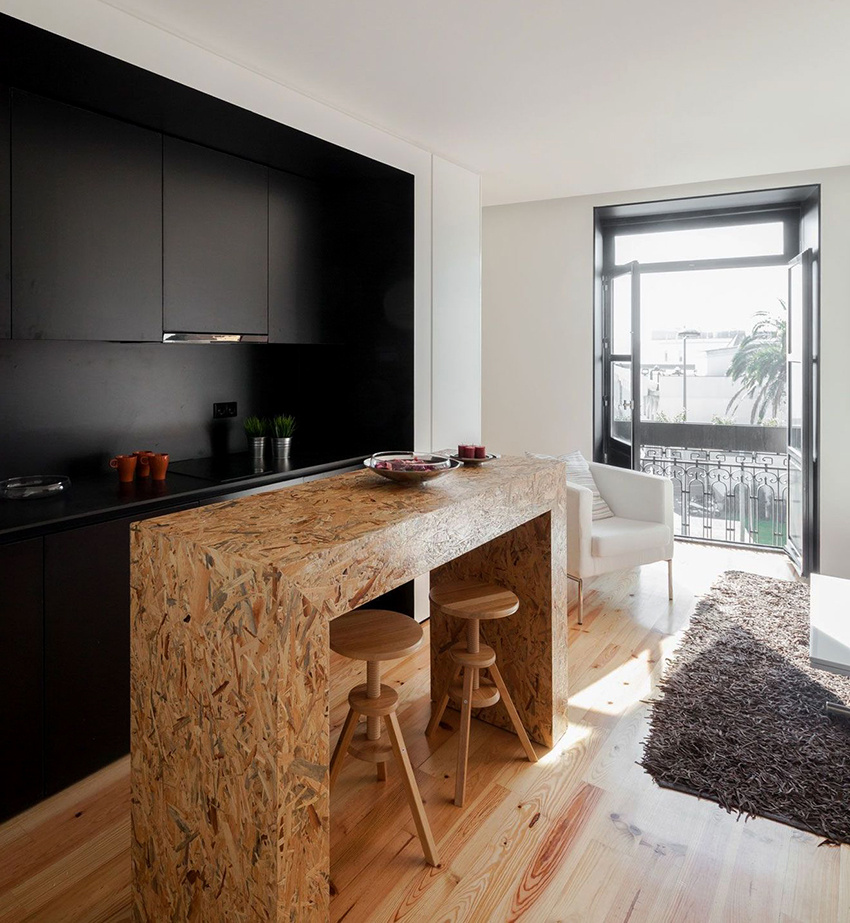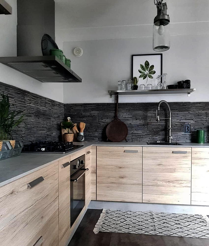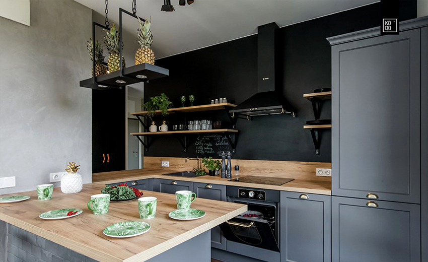 Since black is a versatile color, it will perfectly fit into any room decor. The most popular option is a white kitchen with a black countertop. Photos of examples of the design of such rooms in sufficient quantities can be found on the Internet. In combination with other facades, the dark coloring of the working area also looks beautiful. For example, it will be appropriate in a kitchen with wood-like facades, which will add a little intrigue to a boring atmosphere.