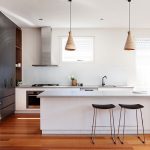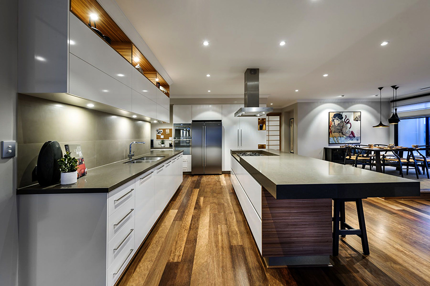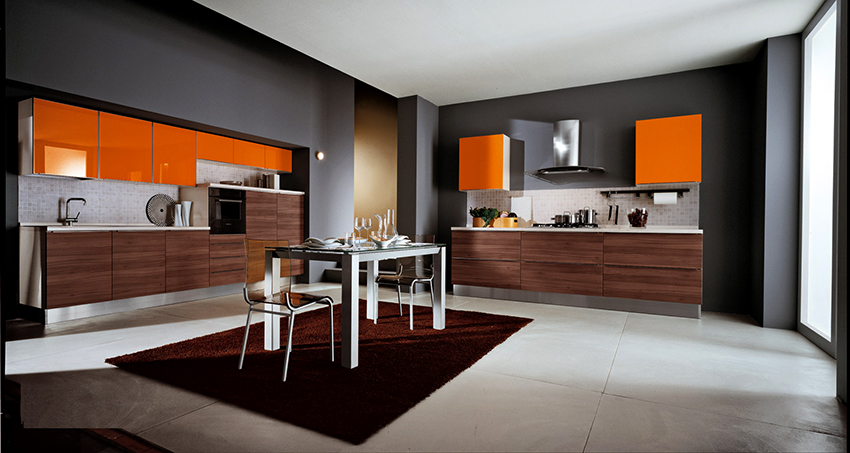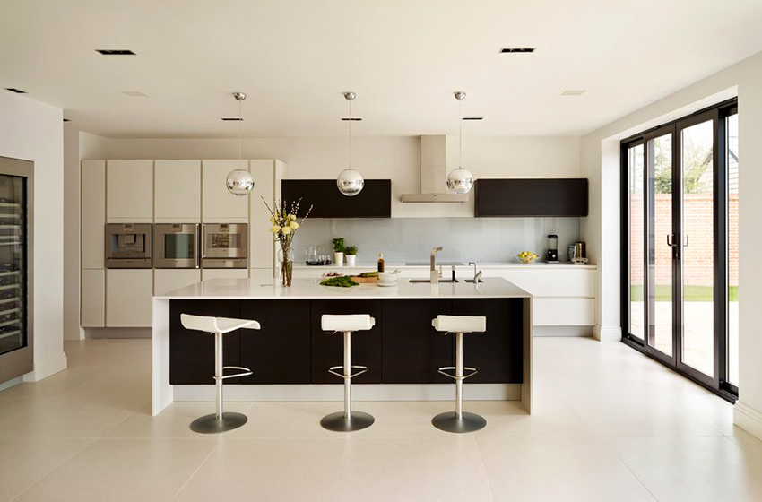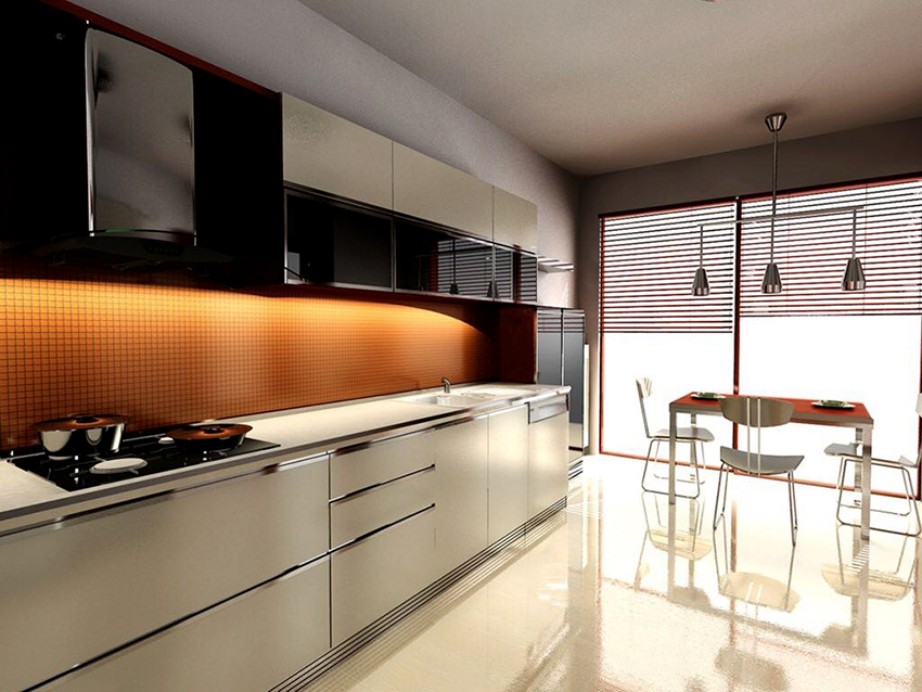 Additional decor in such kitchens would be unnecessary. Here, laconicism and simplicity are welcomed in everything: in clear lines of facades and in strict forms of cabinets. Fittings are best selected from chrome-plated steel.A combination of different textures of materials is permissible.