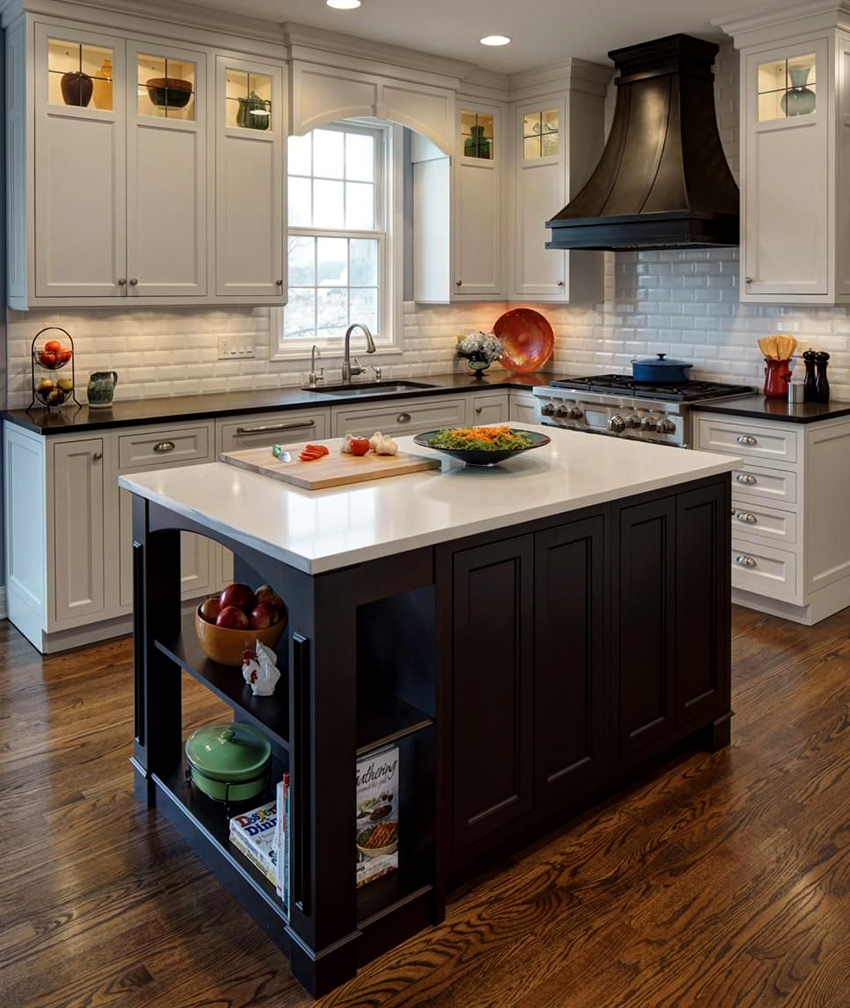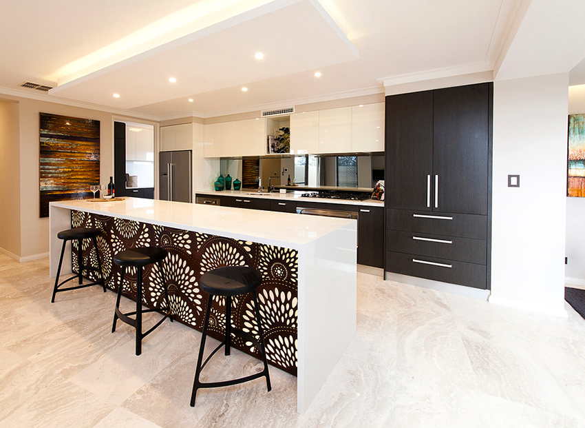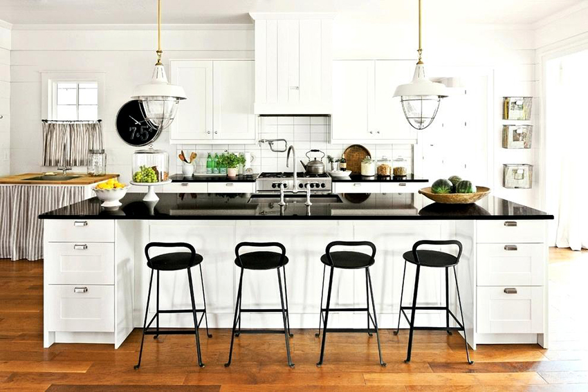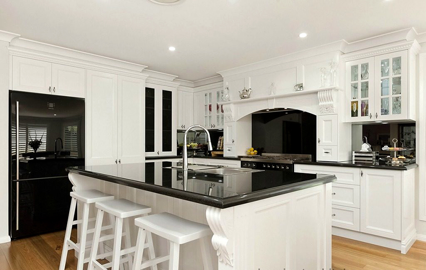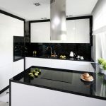 If the choice is made in favor of the classics, then the room should contain elegant furniture with carvings and decorations in the form of moldings. Natural or artificial black stone floors are ideal. The high-tech interior, which is characterized by progressiveness and functionality, has clear lines, and the contrasting combination of black and white emphasizes its stylishness. It is better to complement the black countertop of a white kitchen in this design with the shine of metal of household appliances.