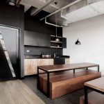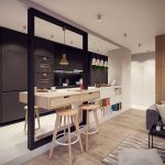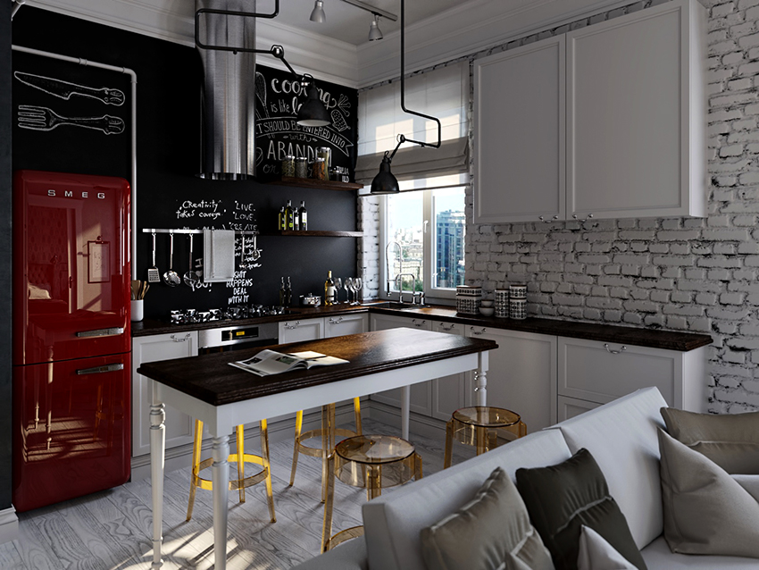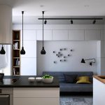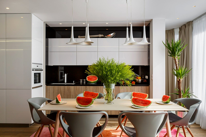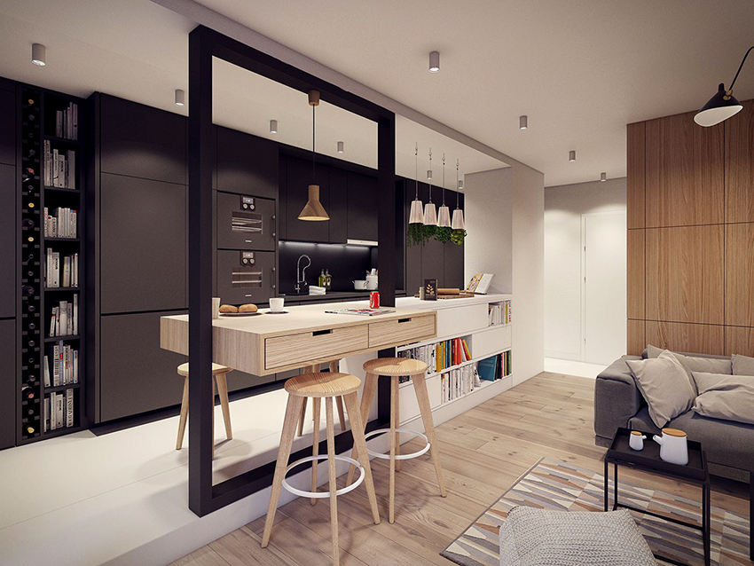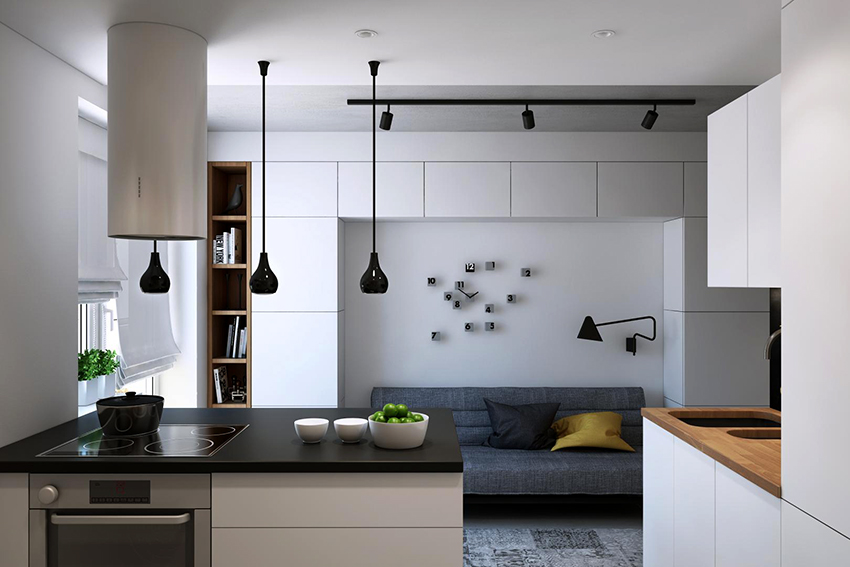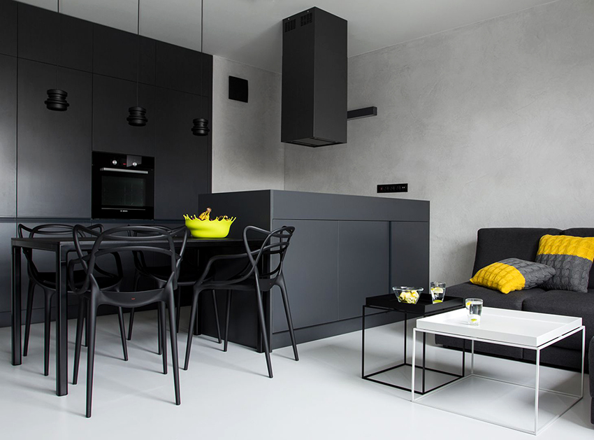 It is not without reason that designers often choose black furniture to create the interior of studio apartments, where the kitchen is combined with the dining room and living room. The black and white kitchen-living room with catchy accents looks especially stylish.