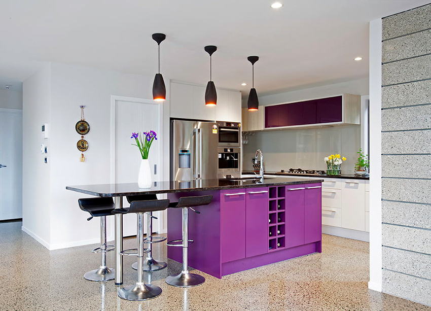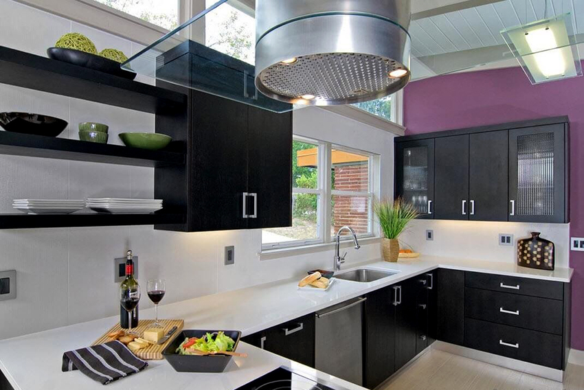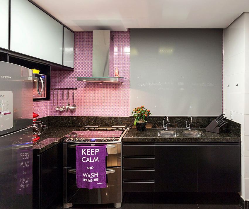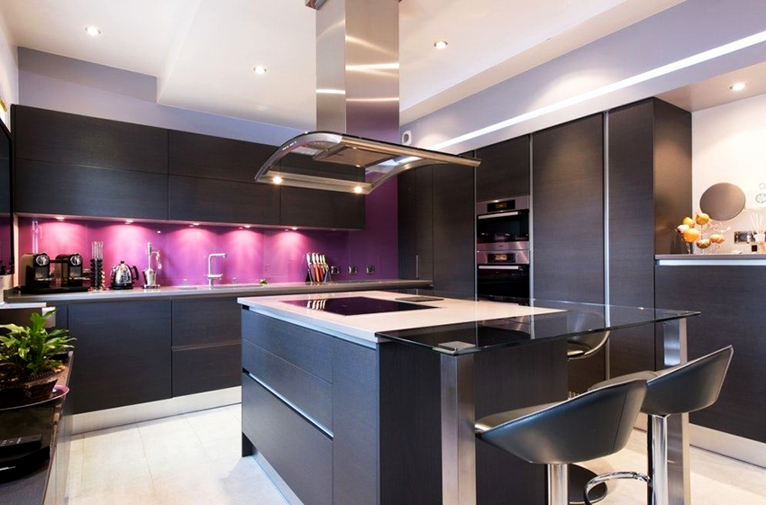 When the kitchen is based on a black set, the main thing is not to be mistaken with the background color. The best option would be to use contrasting light shades that emphasize the simplicity, sophistication and depth of black furniture, which is assigned the main role. A bright addition to the light finish can be accent elements of red or purple.