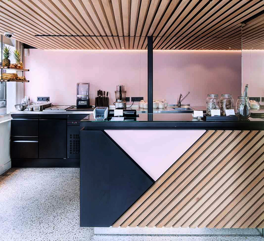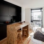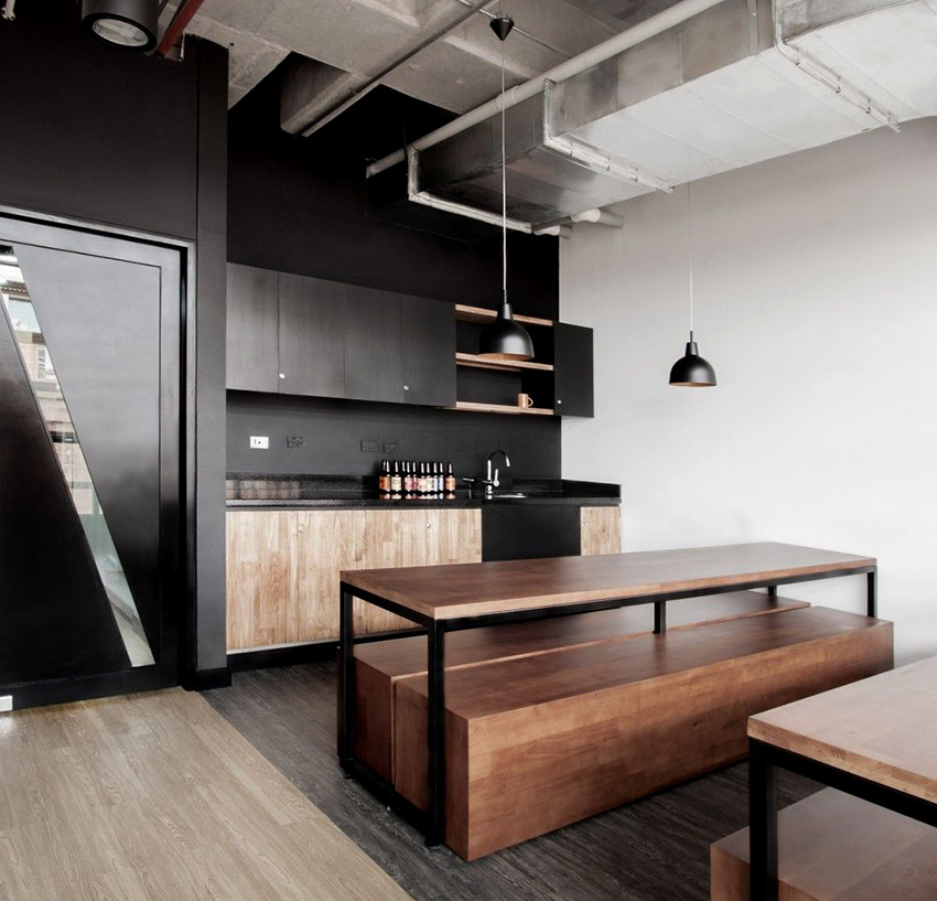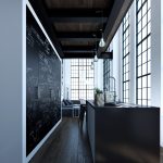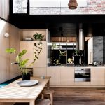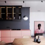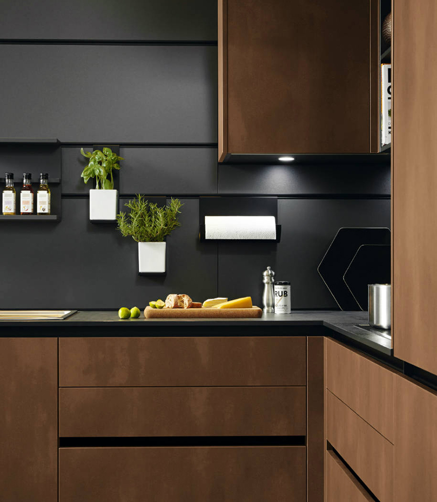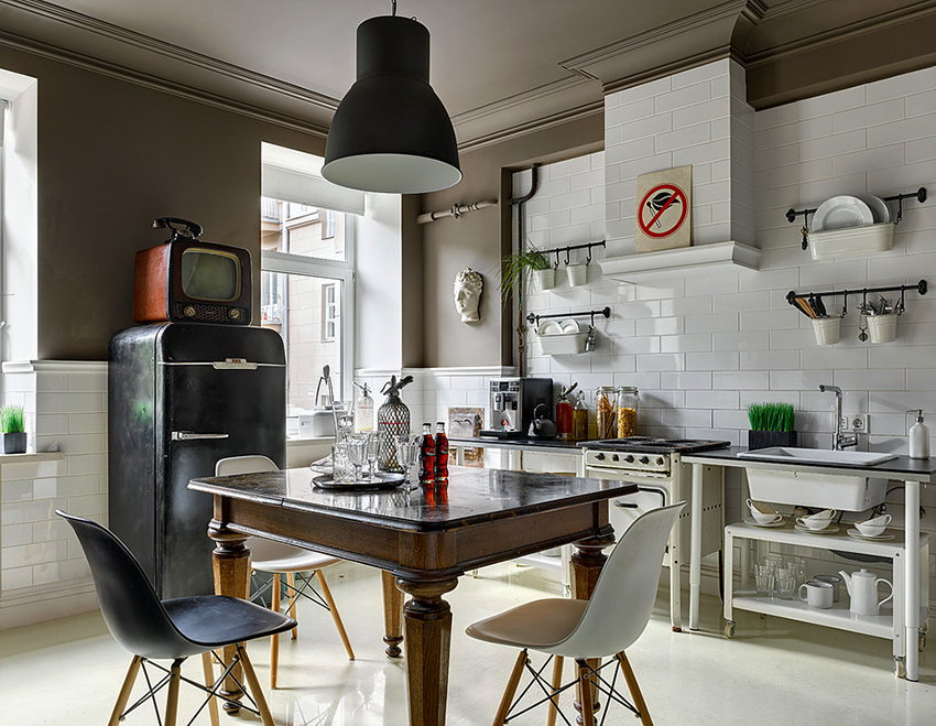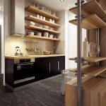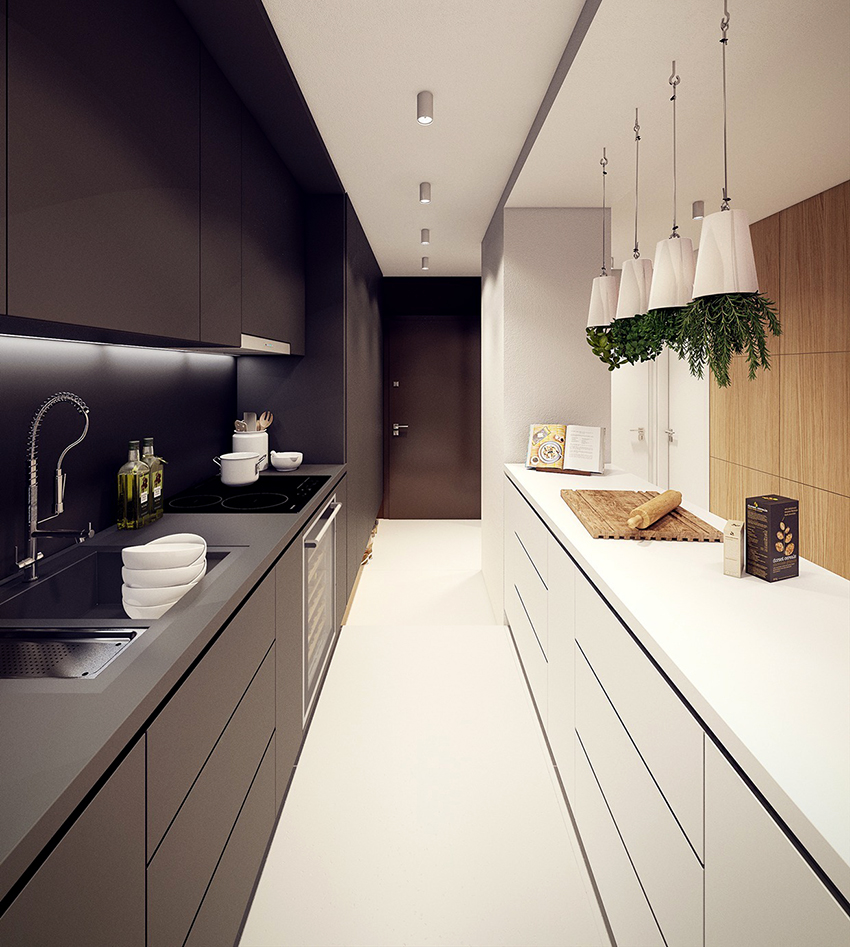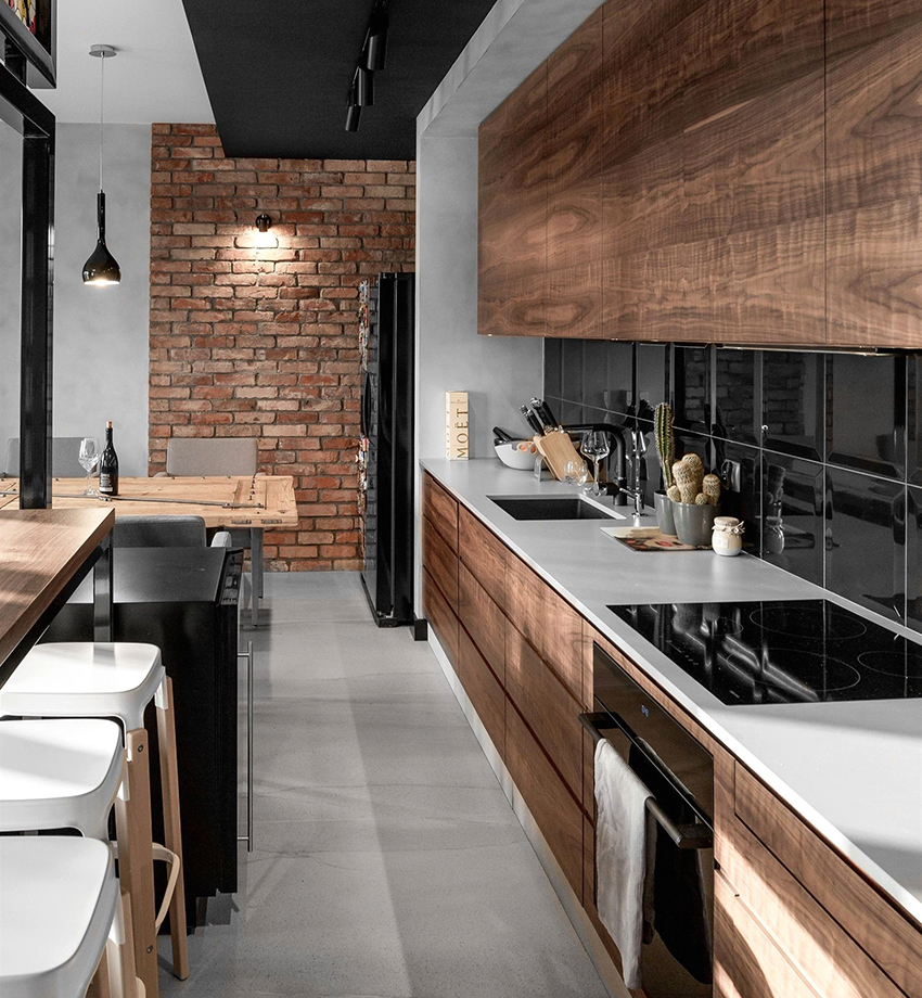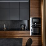 The black and beige kitchen helps to soften the dark gloom, creating a cozy atmosphere of a sophisticated coffee shop. Additions from natural fabrics and materials will perfectly fit into such an interior. The result is a modern and natural environment.