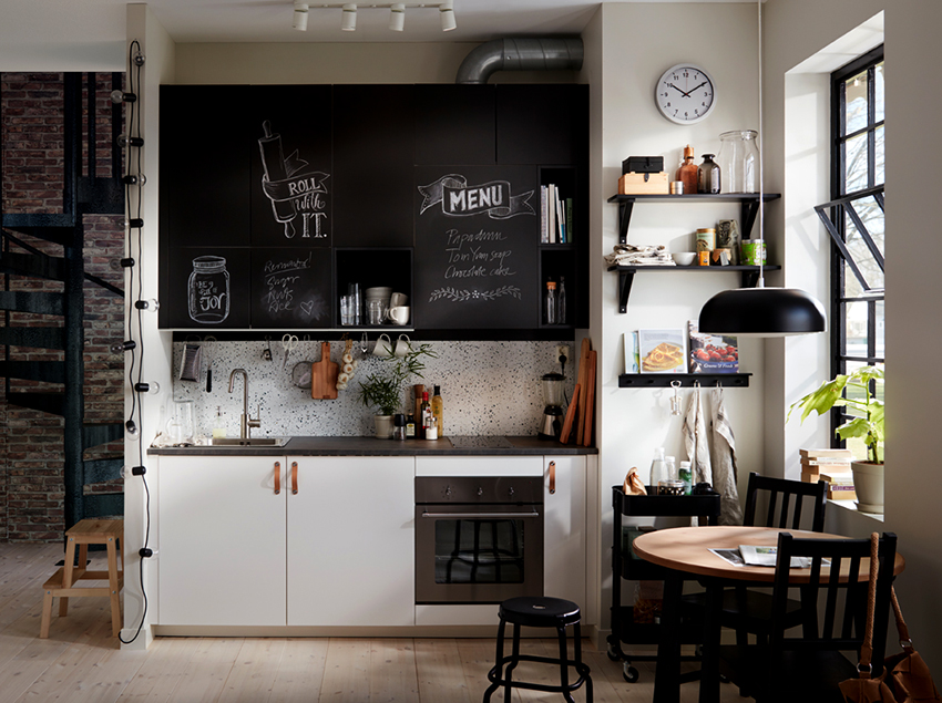 - The predominance of black will be appropriate in the colors of the facades, while some elements will remain white: furniture in the dining area, countertops and decor items.