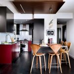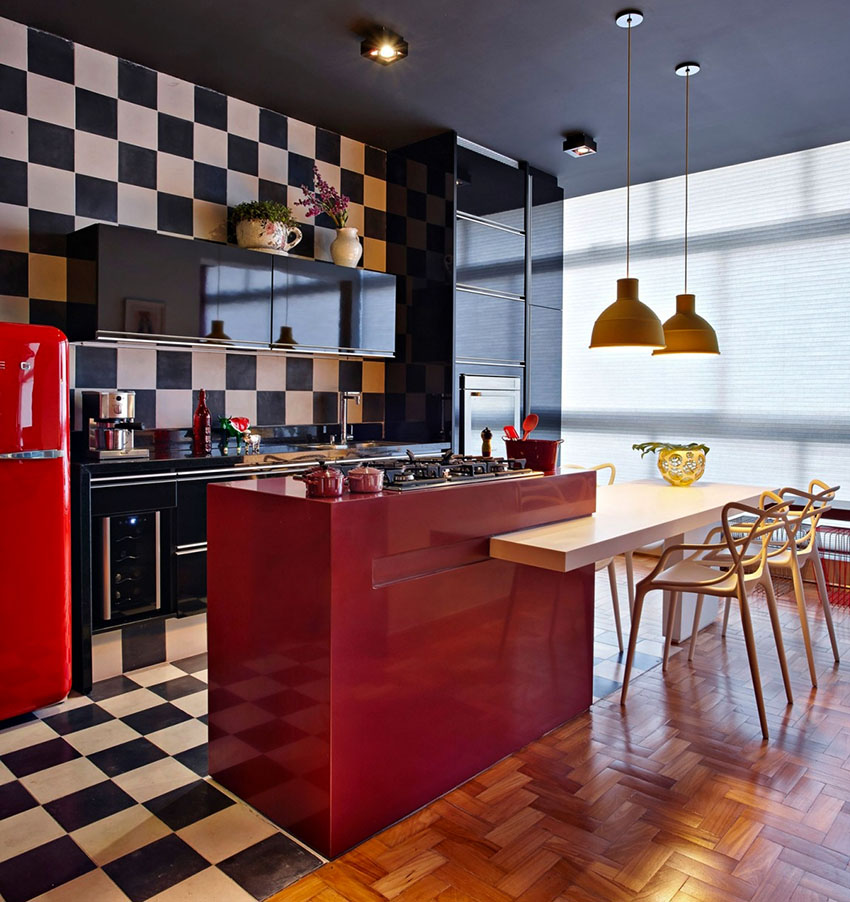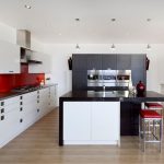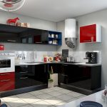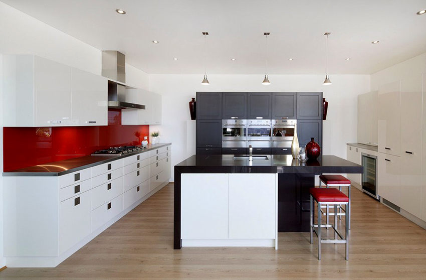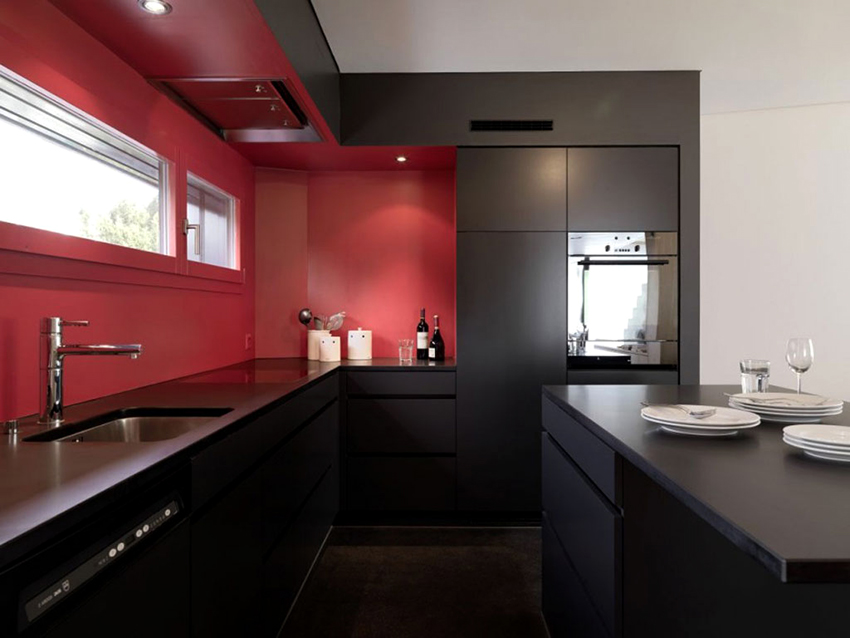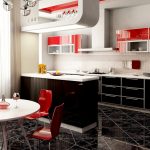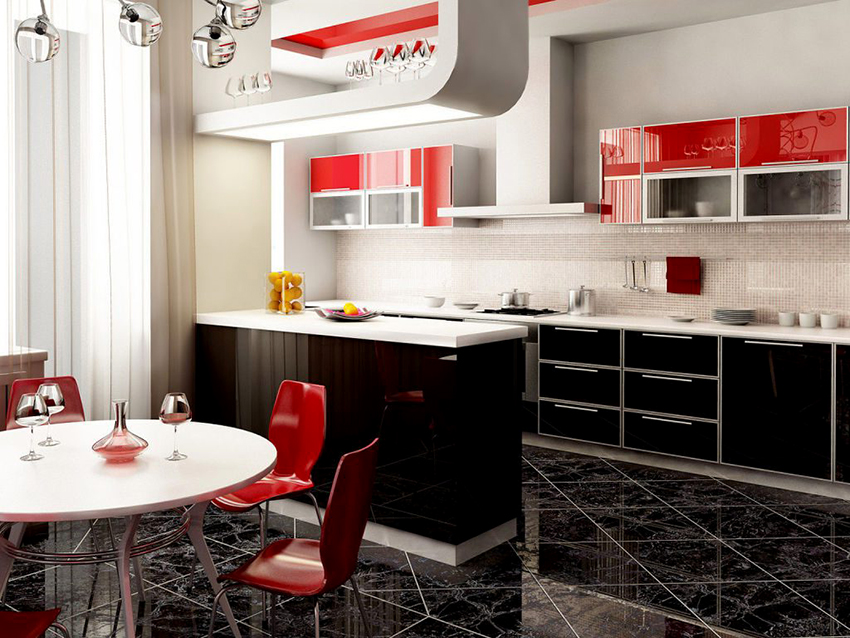 In the design of a red and black kitchen, a photo of which can be easily found on the Internet, in order to avoid aggressiveness, it is permissible to use not only these two tones. The third color in the interior will distract attention from the saturation and depth of the main colors and balance the color scheme in the room. As a complement to such a color, it is better to choose light colors, ideally a black-white-red kitchen, which contributes to a visual increase in space. This setting will help relieve the tension caused by red and black.