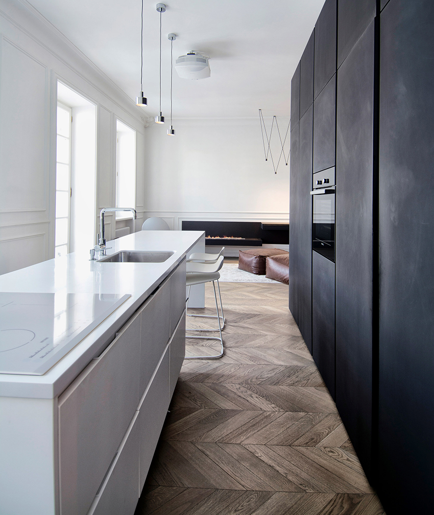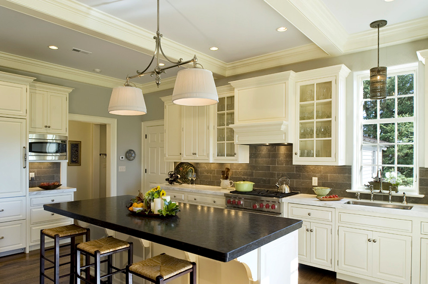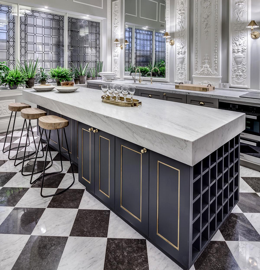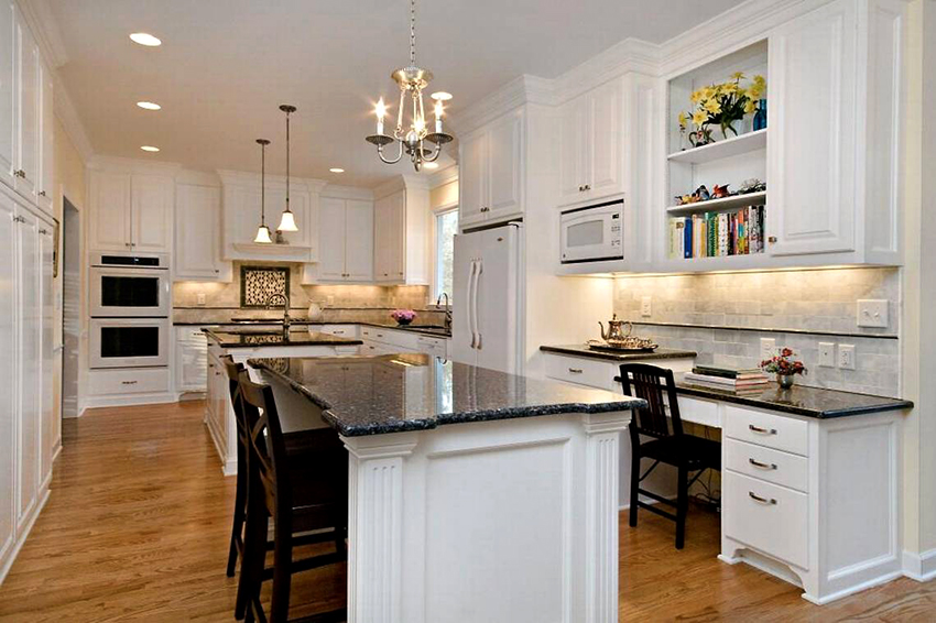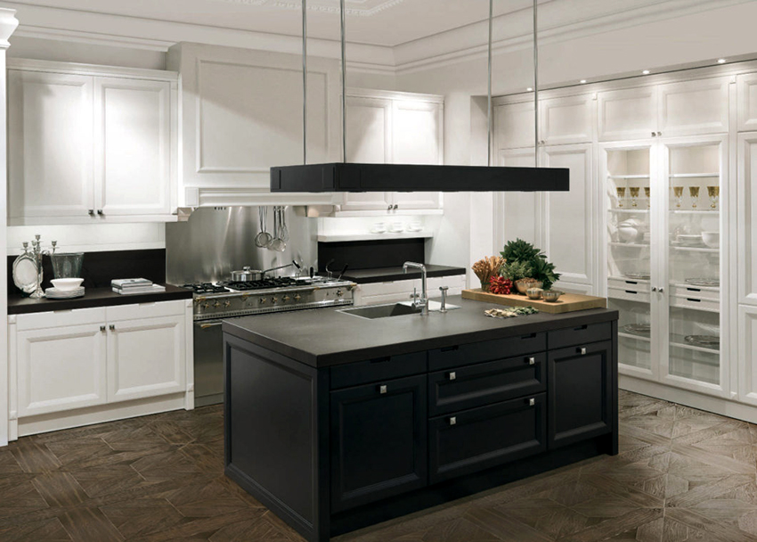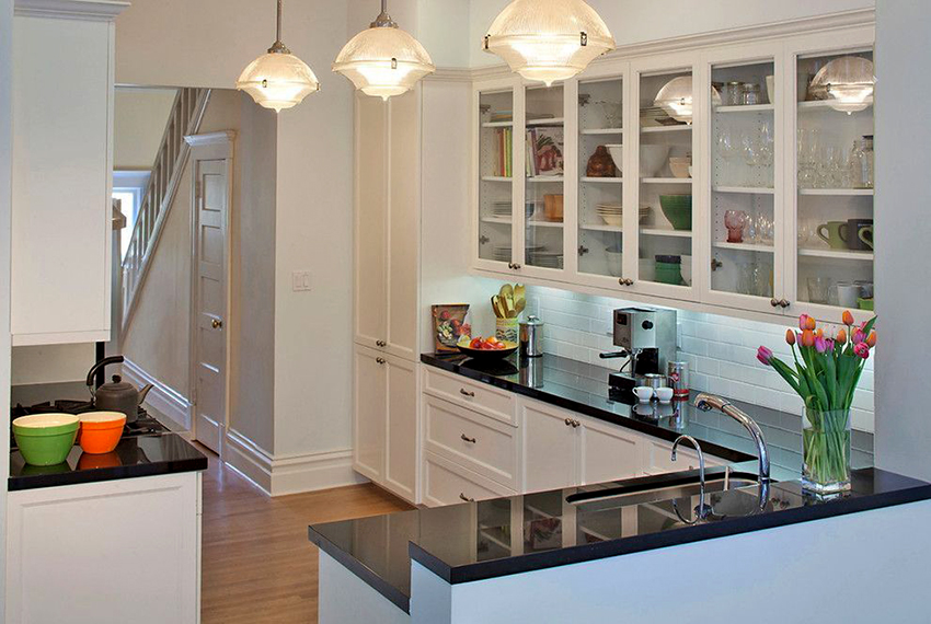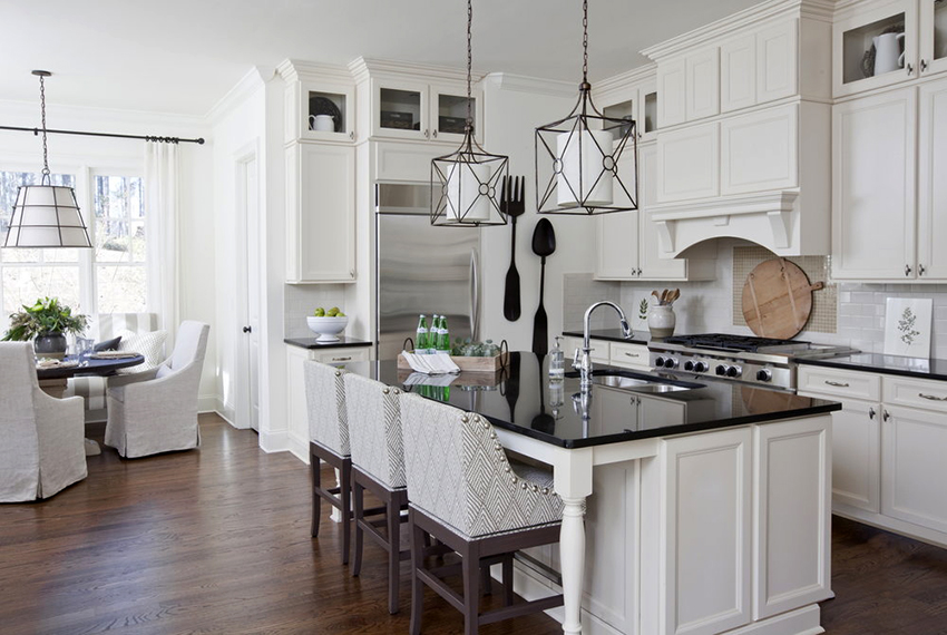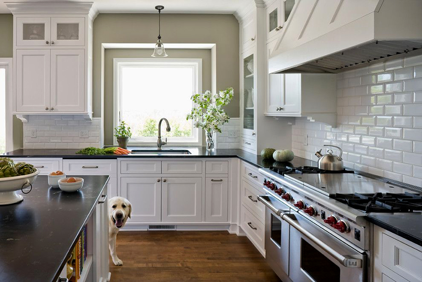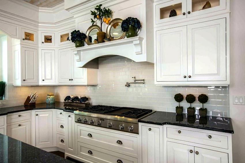 Combination white kitchen and black countertops look the most advantageous in the style of a modern classic
