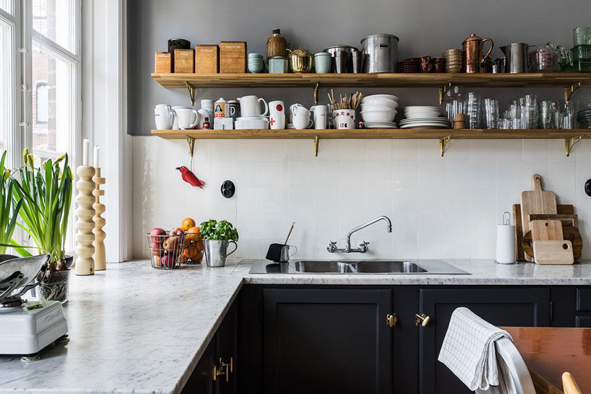 Black countertops are most often completed with white headsets. Two opposite colors end up making a perfect match. Most often, such a combination can be found in styles such as modern classics, art deco, less often loft and baroque. The most harmonious will be the interior of a Scandinavian kitchen, where a black countertop clearly separates the top and bottom of the working area. In addition, this effect contributes to the visual expansion of the kitchen and eliminates the feeling of sterility in the white room.