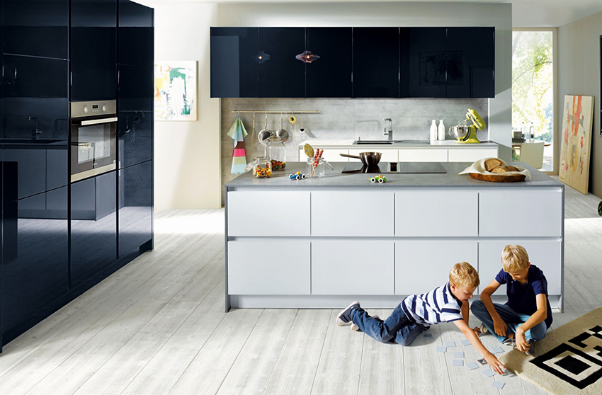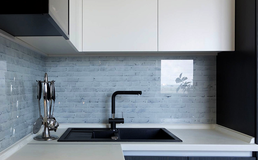 At the same time, prints and streaks will be much more noticeable on the worktop of a black glossy kitchen. In order not to be mistaken with the choice of coating, you can take samples for a sample and check them in the following way: wipe with a damp sponge, allow time to dry, then sprinkle with water without wiping, and tap the surface with your fingers. After such procedures, it will be easy to assess to what extent marks remain on the countertop and whether they can be easily removed.
