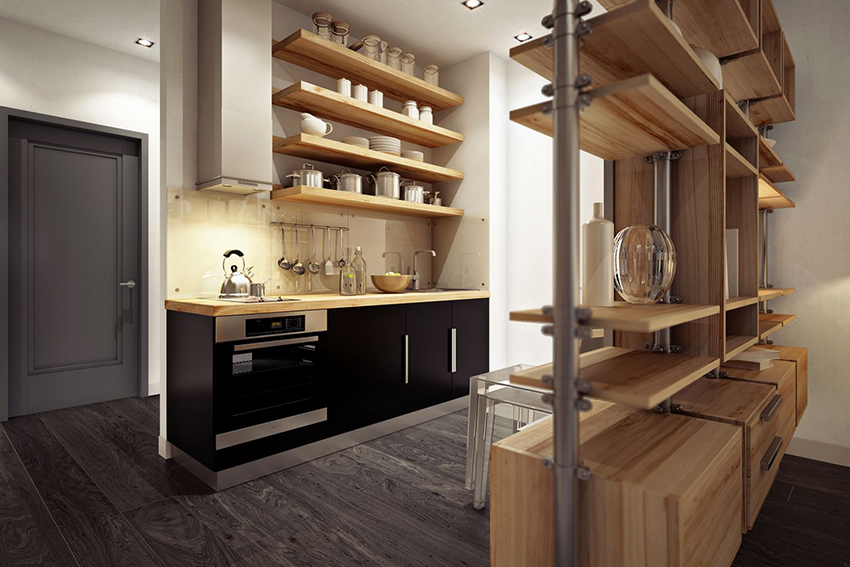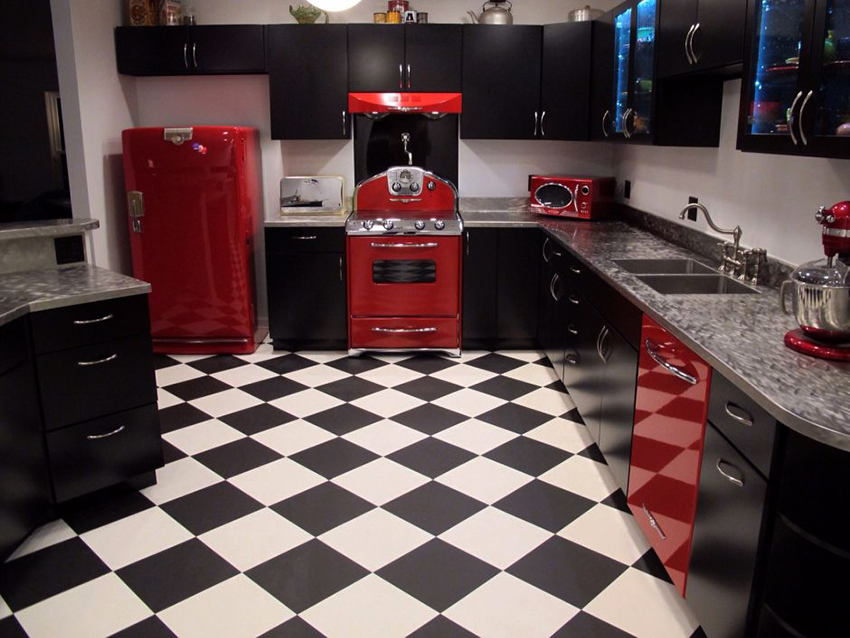The black floor will add respectability and high cost to the interior, but it will visually reduce the space. Covering in dark colors is unacceptable in small kitchens, as it will steal the already missing space. At the same time, black flooring will create an excellent combination with walls painted in different colors.