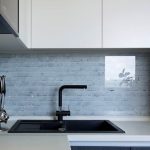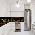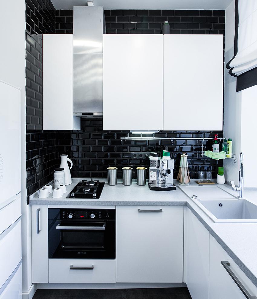 - The main white is present in the colors of the upper facades, walls and ceilings, and black acts as the color of the lower facades, countertops and floors. Black and white tiles in the kitchen will look especially harmonious in the decoration of the apron and the floor.