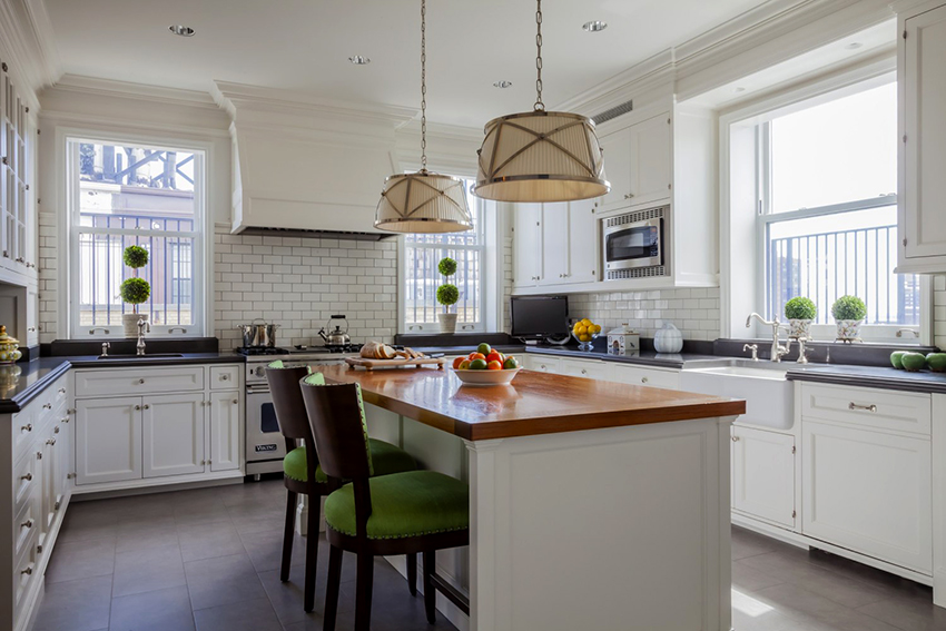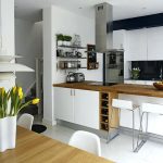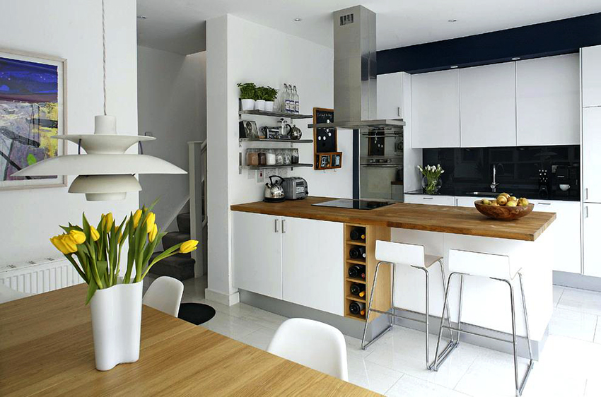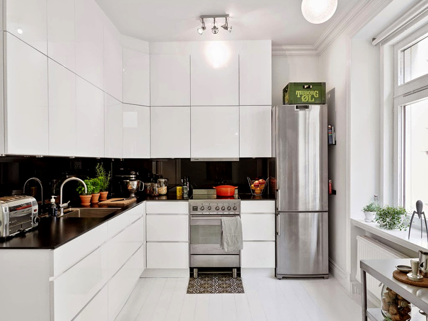If you combine a white kitchen with a black countertop and an apron, then a multi-level effect will appear in the room. These interior details will emphasize symmetry and balance, giving the furniture a chic look. At the same time, such a countertop will be in the spotlight, so it must be kept perfectly clean. This is especially true of gloss kitchens. Photos clearly demonstrate both the advantages and disadvantages of this design.