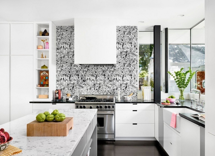 In order for the drawing to look harmoniously in the interior and not stand out from the overall design, the image on the screen is considered not separately, but as part of a single composition with a furniture set. At the same time, the apron can fit into the interior or be used as a bright accent if the furnishings are made in a restrained range.