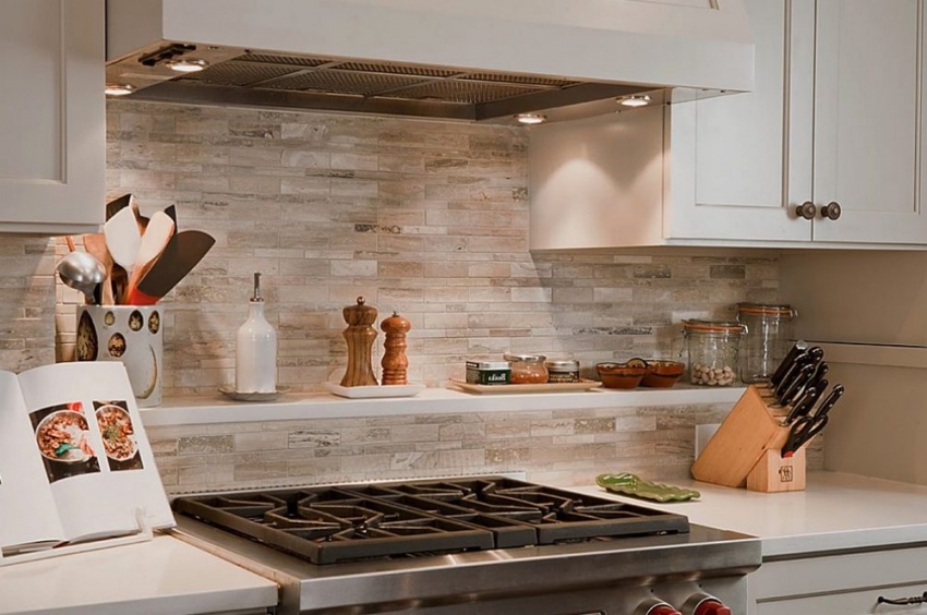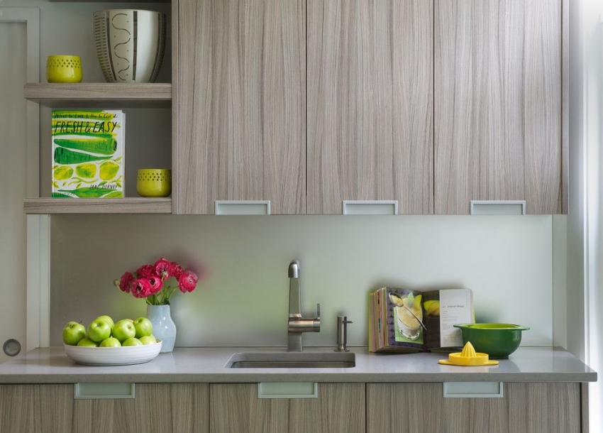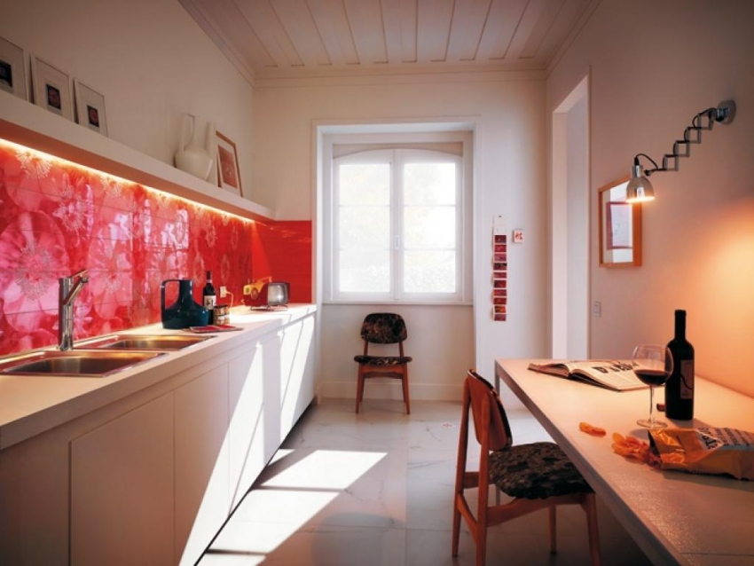 The space of the working area is limited by wall cabinets on one side, and a tabletop on the other. To effectively organize this area, you can buy a kitchen apron made of plastic. This material will serve as an inexpensive and high quality coating with optimal performance.