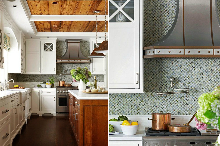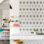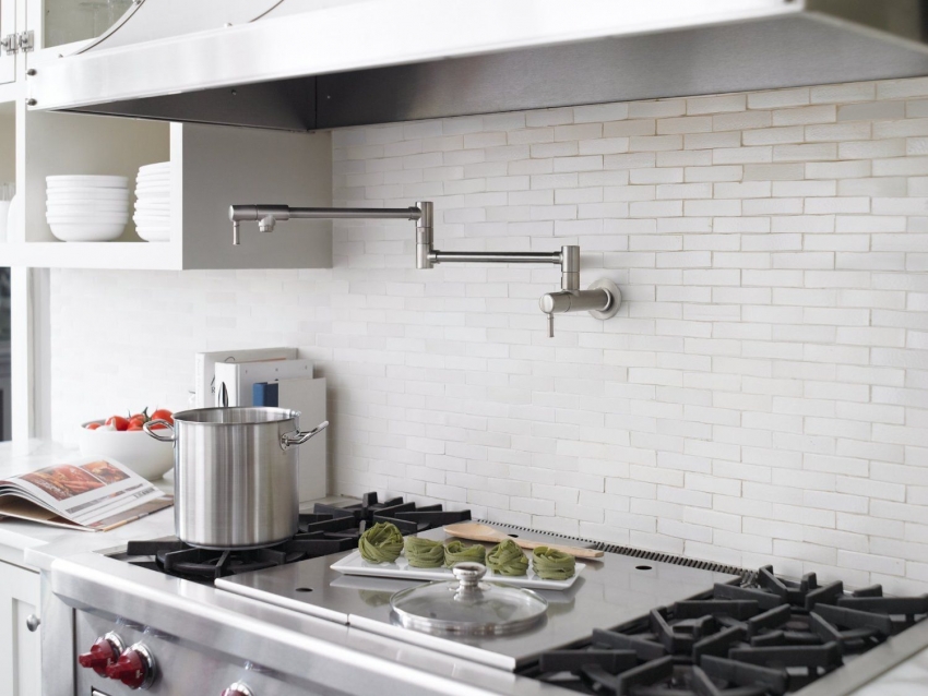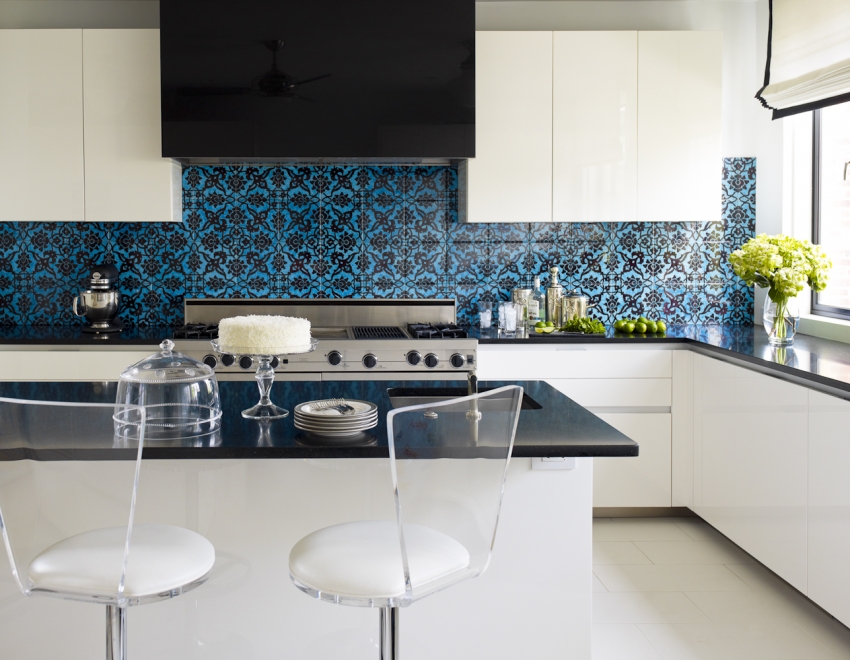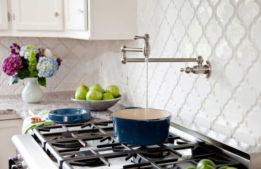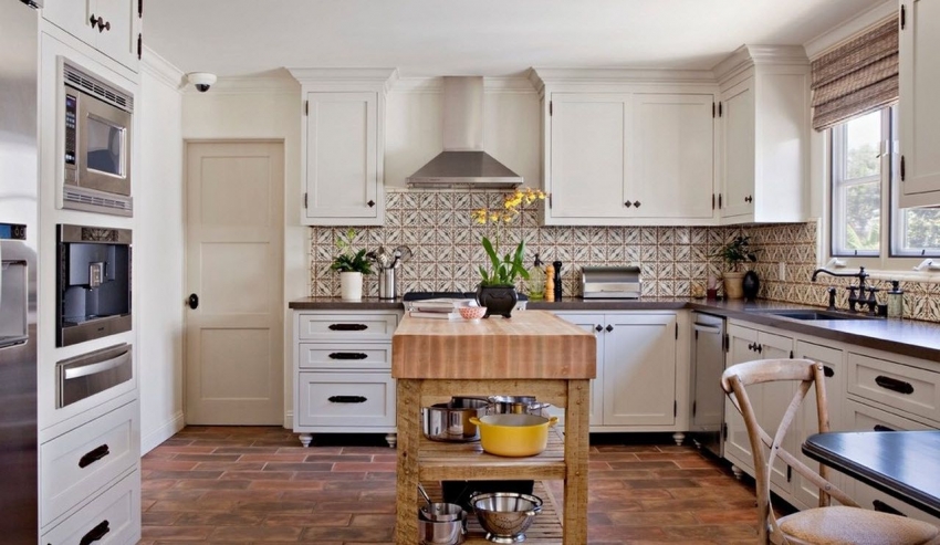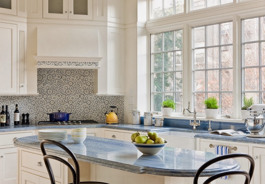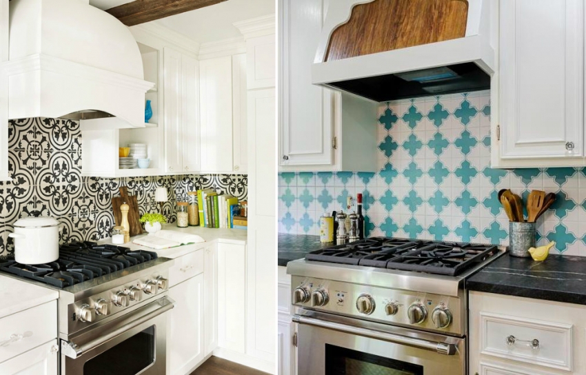 For classic white kitchen you can use tiles with interesting ornaments, which will make the interior more modern