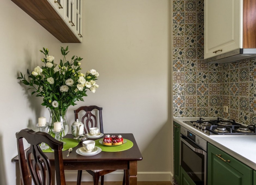 A completely different approach is required if you need to adhere to the classic kitchen design. Imitation of stone will be appropriate here, as well as smooth ceramics with classic decor. An antique ornament is a great idea. In addition, you can always use a small plain tile, since it is versatile and will fit perfectly into any interior.