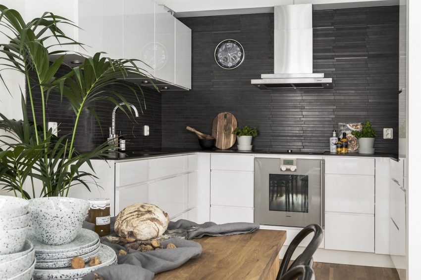 The use of monochrome shades of ceramic tiles for kitchen decoration requires bright accents and accessories in the interior.
