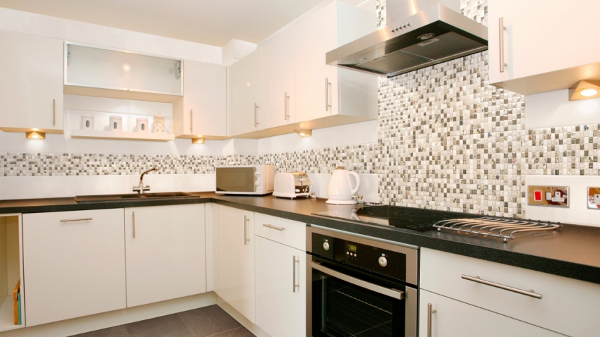 It is recommended that the tiles go 2-3 cm behind the upper and lower cabinets, and in the area of the hood the apron is higher. This should be taken into account when calculating the required amount of material.