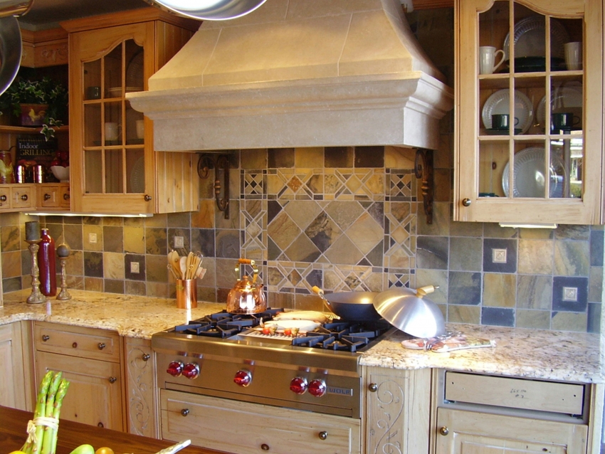 A decorative tile panel is most often placed above the stove, which takes the central place in the kitchen set.