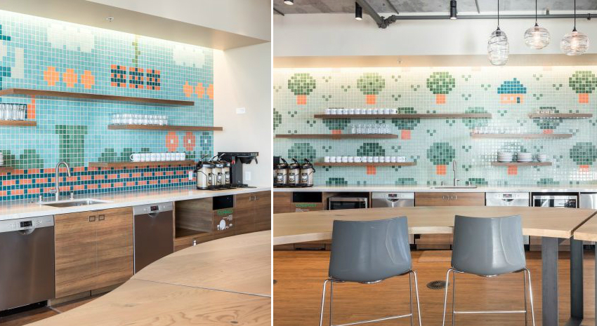 Patterned tiles (flat or embossed) is the most common option. As a rule, they are the same size as the background elements and differ only in the presence of the pattern. Laying can be done pointwise, so that the elements are located at an equal distance from each other, or grouped into a small panel.