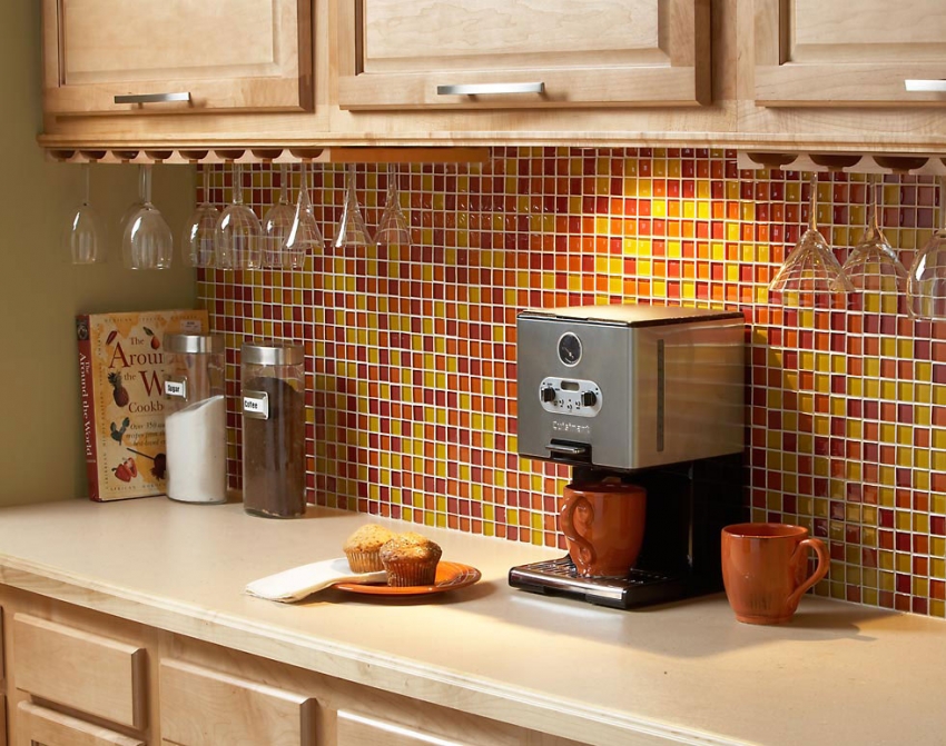 A great idea is to use a mosaic, the size of the elements of which is 5x5 cm. Such segments will not be too small, but at the same time they will give the interior a mood. You can verify this by looking at the photo of aprons for the kitchen made of ceramic tiles.