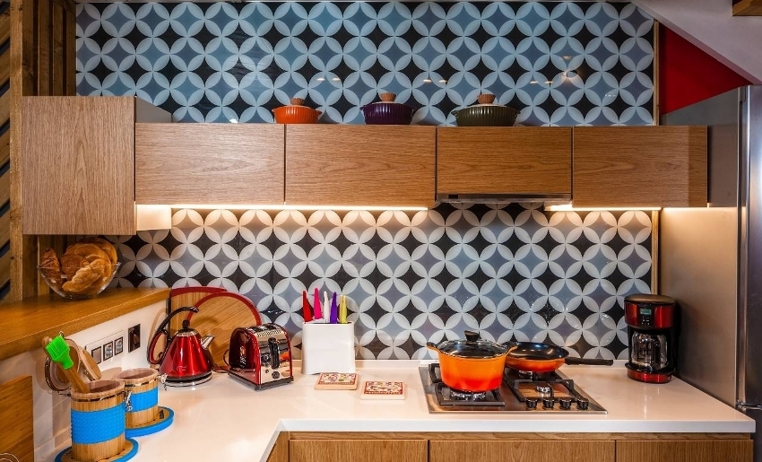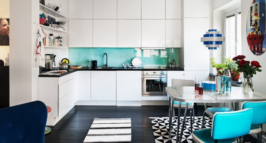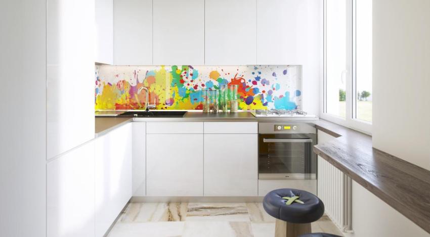 Colored geometric elements on a glass apron are ideal for those who want to dilute the interior with bright colors