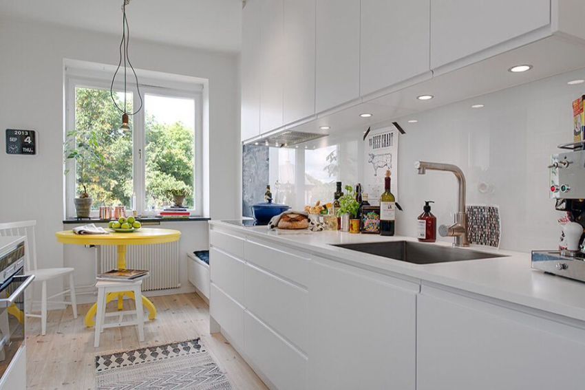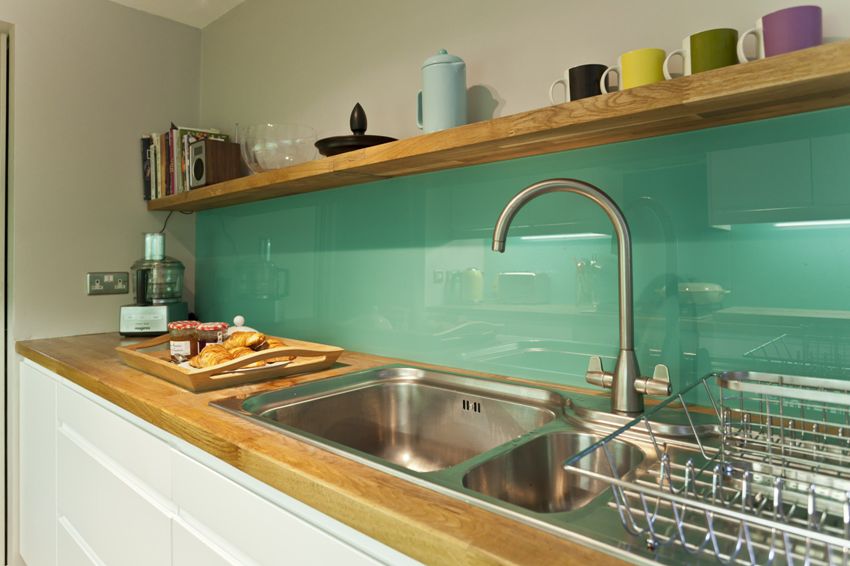 - due to the reflective effect, the glass apron will visually expand the modest kitchen space;