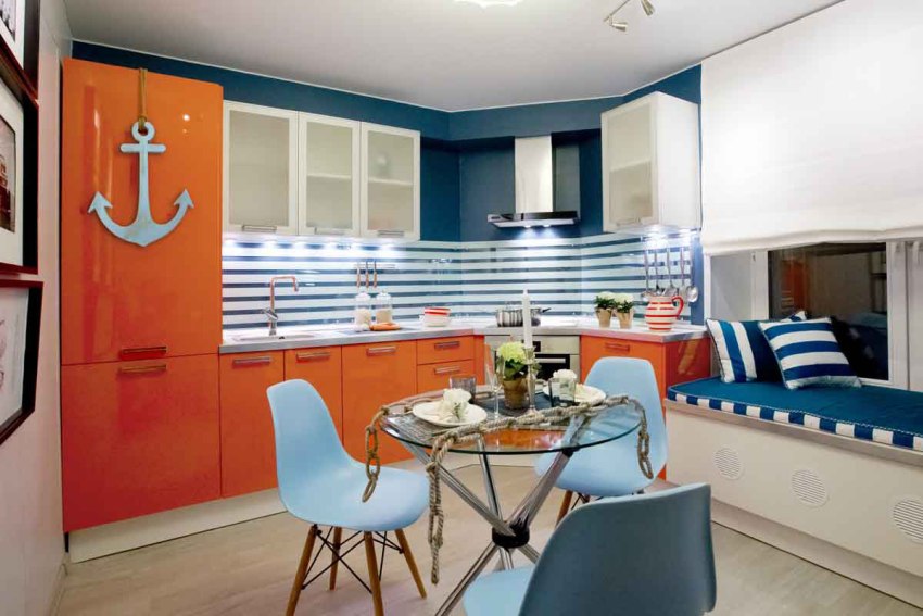 Often wallpaper or painted walls are covered with glass so as not to overload the kitchen interior with dissimilar surfaces.