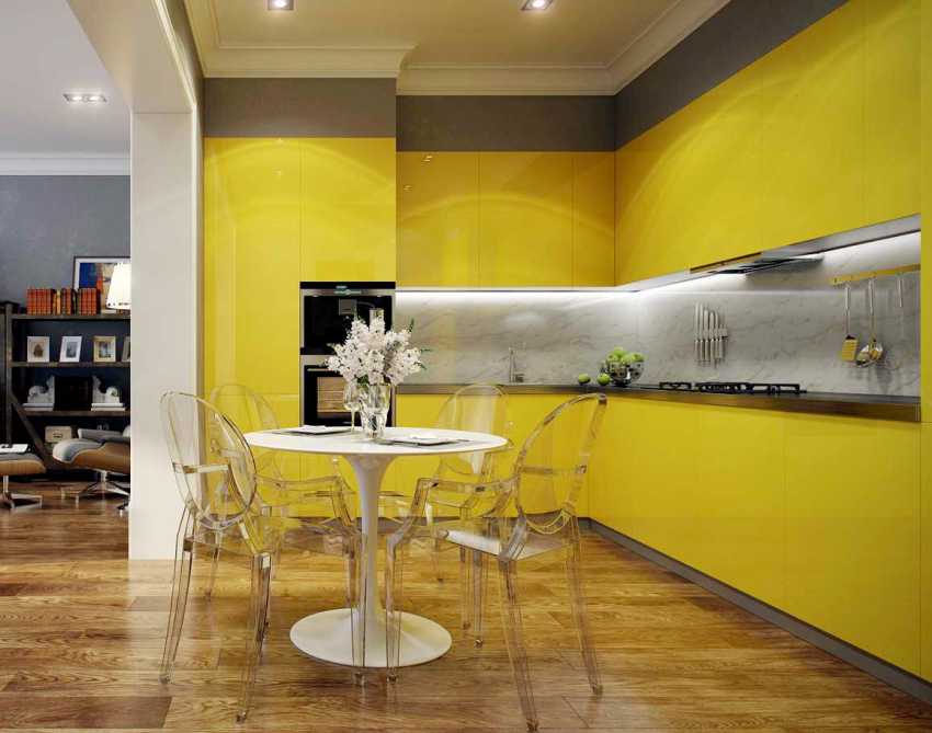Glass panels look much more harmonious in the interior of kitchens in a modern style, as they are ideally combined with the facades of the headset, as well as with chrome elements of household appliances