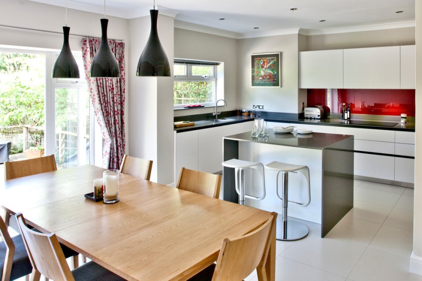 Stylish red panel is able to create an unusual contrast effect when properly combined with white and black kitchen furniture