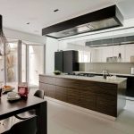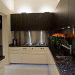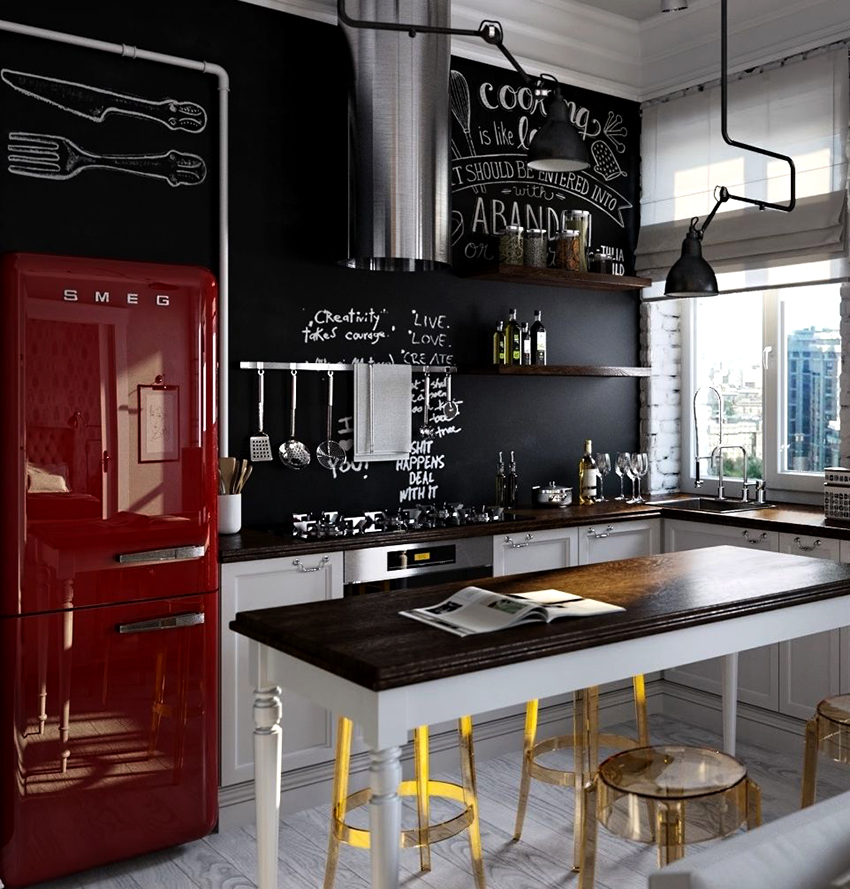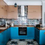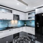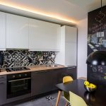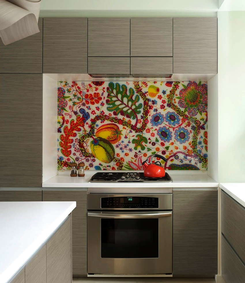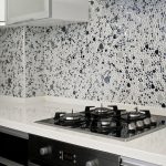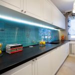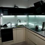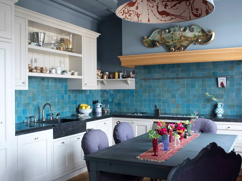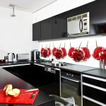 A dark apron is not the most practical option for the kitchen. Water droplets and dust will be visible on its surface. On the other hand, greasy stains are not so visible on the black finish, especially if the material is not solid. If an apron of a bright color or with a colorful pattern is selected for the kitchen, then the interior of the room should be decorated in neutral colors.