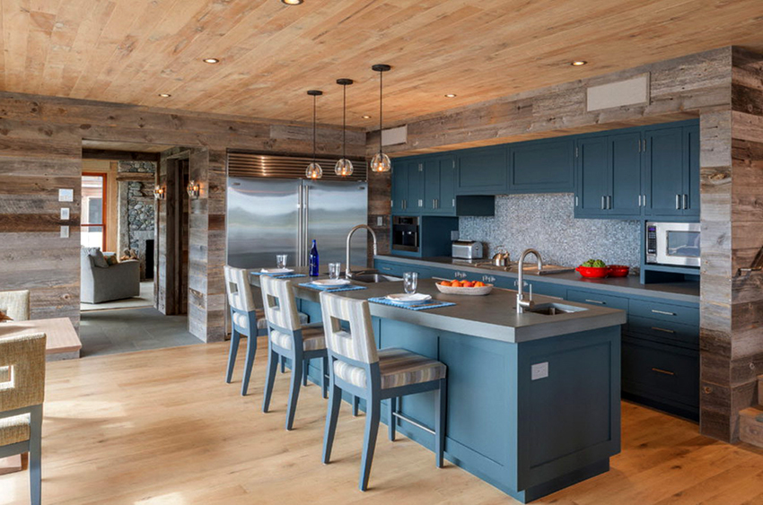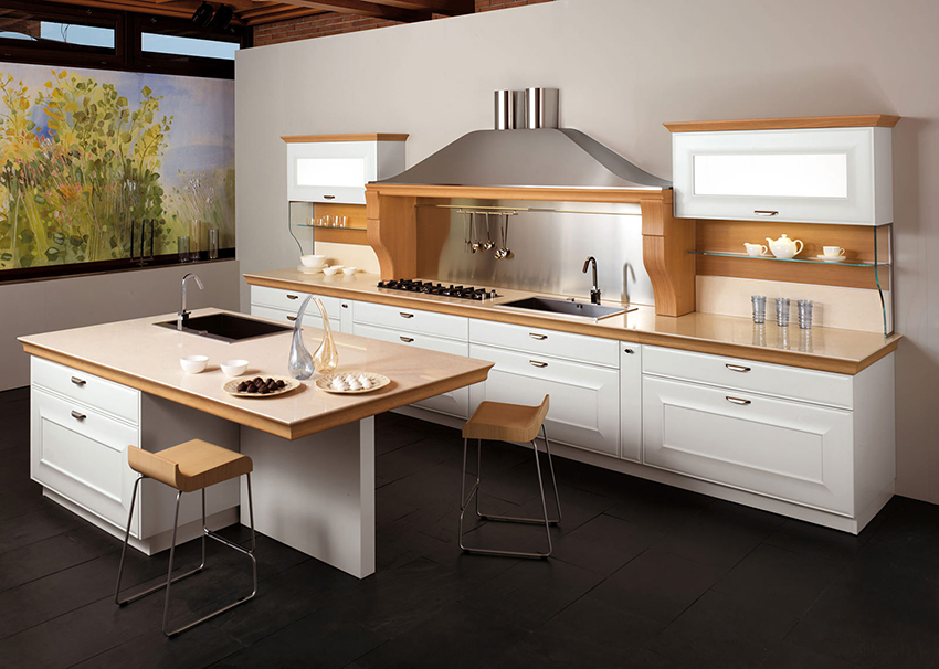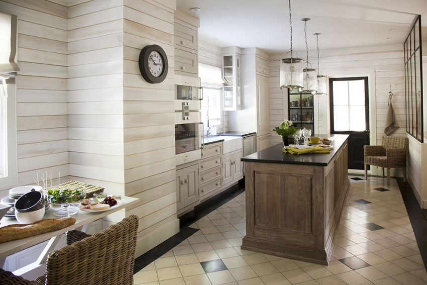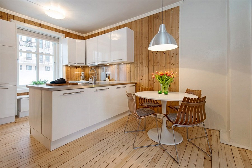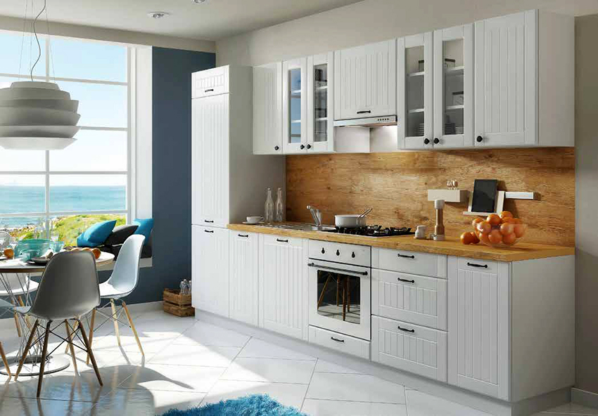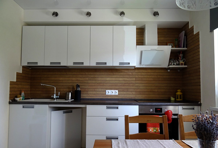 Firstly, it is impractical because the material is afraid of moisture and temperature extremes. Under such conditions, the wood will be covered with cracks, flake off and deform. Secondly, natural material is highly flammable. This type of finish is not the best option for being close to a gas or electric stove.Thirdly, natural wood is too expensive, so it is replaced with false panels for the kitchen from budget materials, for example, from laminated chipboard (postforming).