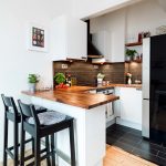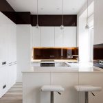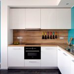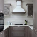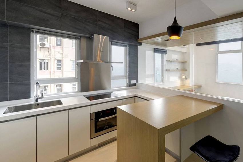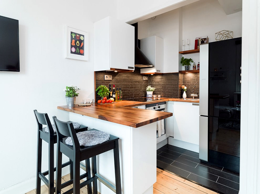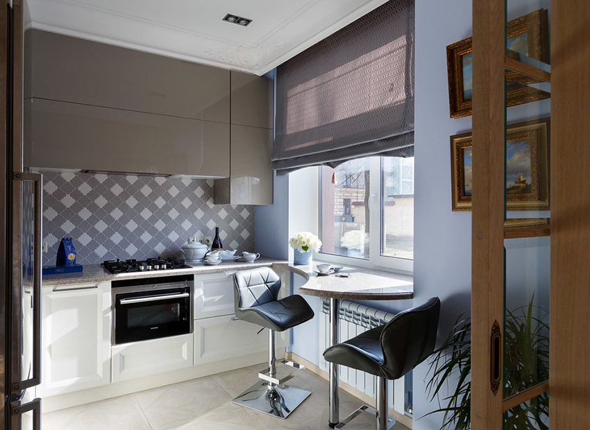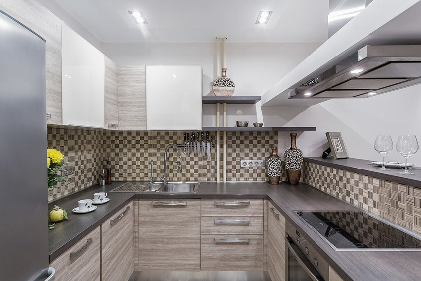 To visually expand the space of a small kitchen, you should choose an apron with a large number of horizontal lines. The best option would be skinny with a striped pattern. For the same purpose, you can decorate the apron in the kitchen with "hog" tiles. When choosing an apron, of particular importance are: